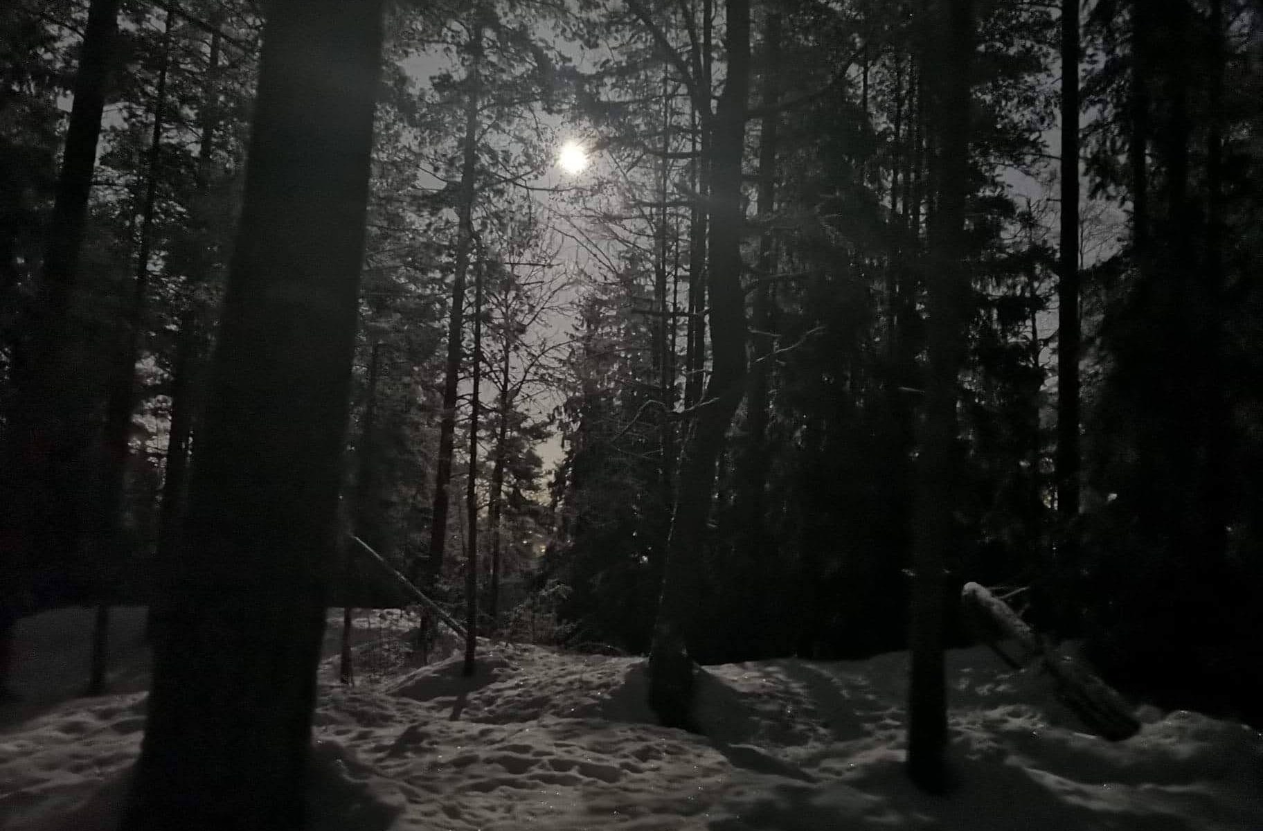 Det er ikke bare på dagtid det er fint nå for tiden. I dag ble det en sen tur, etter at sola hadde gått ned, og fullmånen jobbet seg oppover den klare himmelen. Selv inne i skogen var måneskinnet så kraftig at det nesten ikke var behov for hodelykt, men på de bratteste og mest isete stiene var den grei å ha.