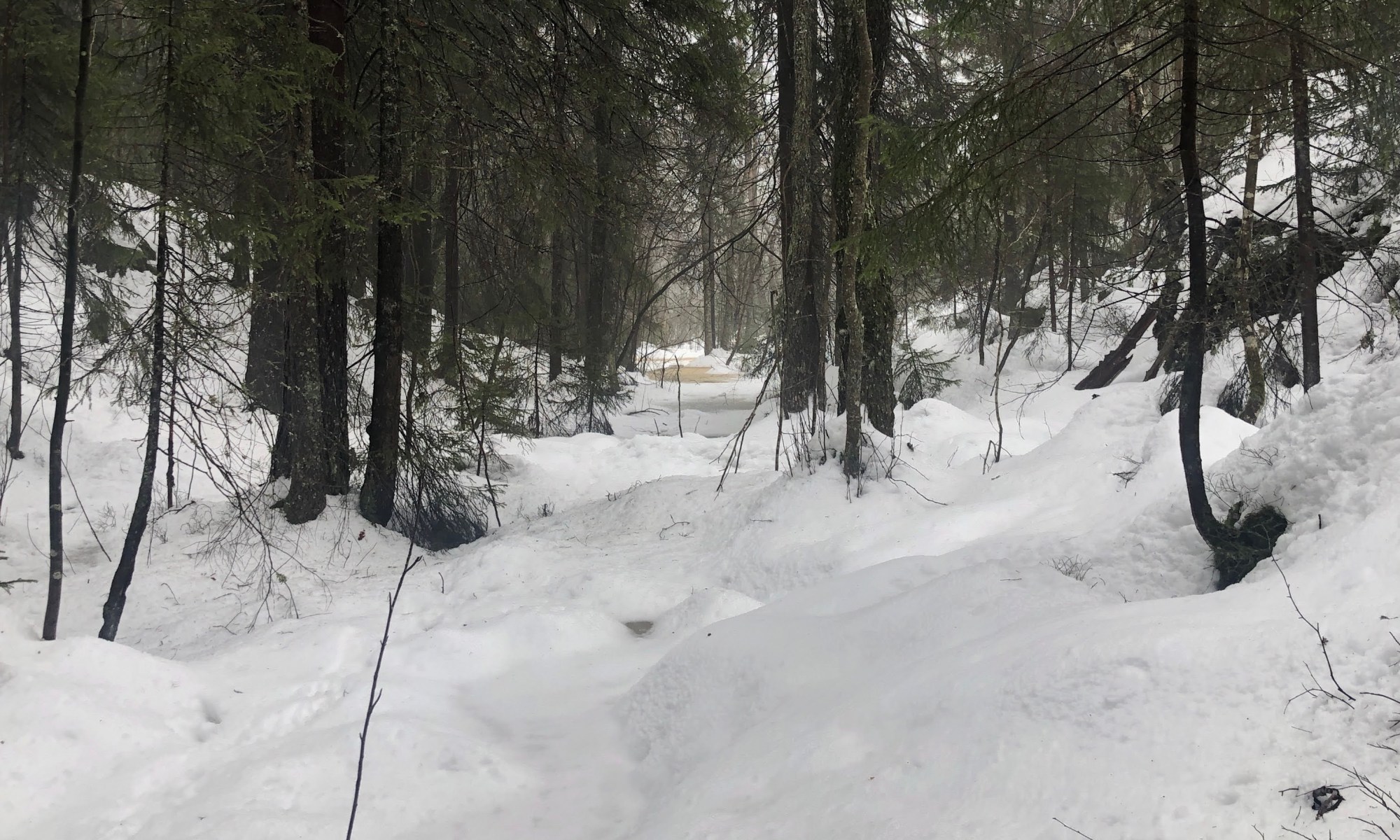 Tåka lå tett i går og i dag så det var dårlig sikt, men alikevel fint å gå i skogen. Fordelen er at dette været tærer skikkelig på snøen. Gikk i samme område både i går og i dag, i skogen vest for Røykås. Det begynner å bli bløtt i snøen, men det går helt greit å gå.