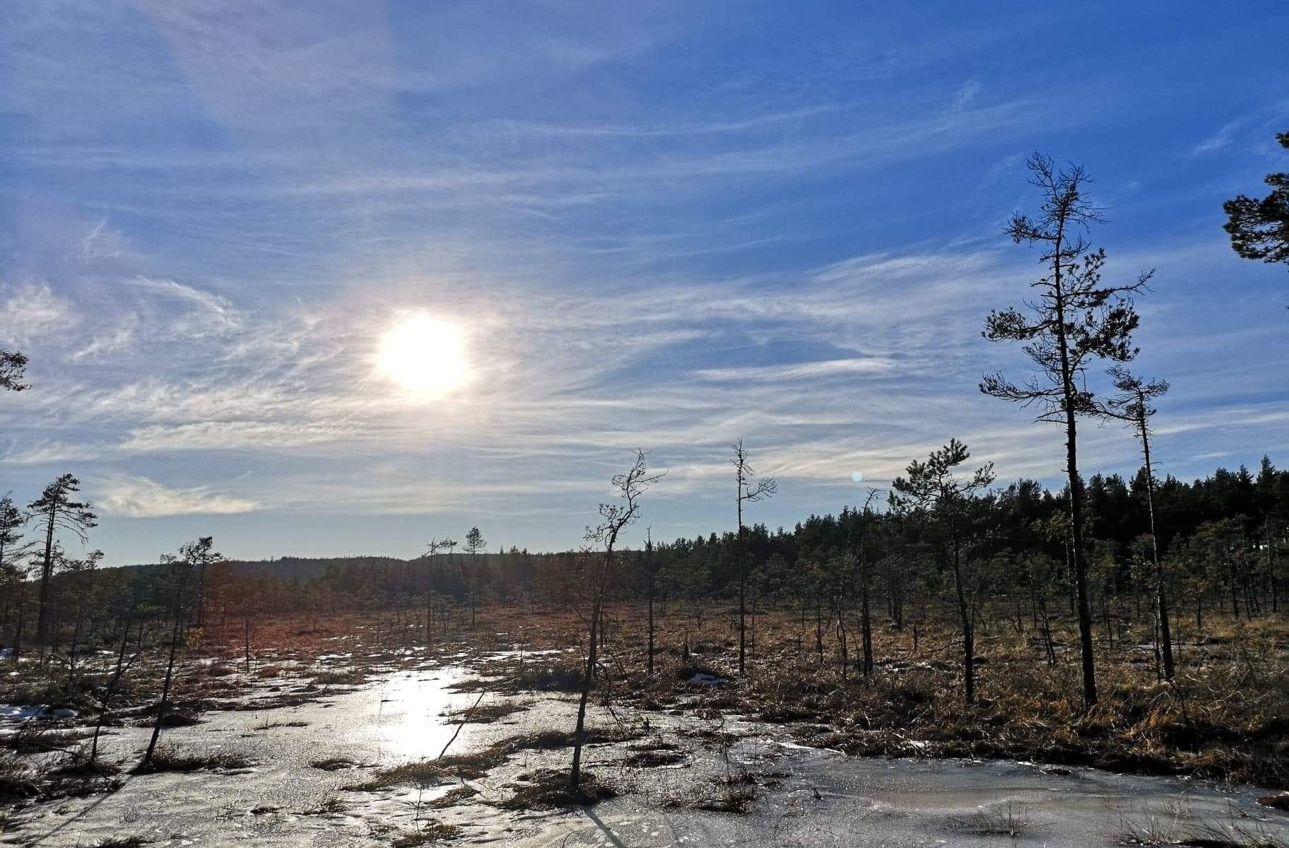 Skogen luner godt, sola varmet, og for første gang på lenge var ytterjakke unødvendig. Det går mot vår igjen! Frida svinset lett i lyngen. Vi gikk videre mot Tretysjøhytta, en skihytte som har servering når snøen og skisporene dominerer, men de var ikke der i dag. En liten vanningspause av Frida her også, før vi gikk videre. Planen var å lage middag i sola, så vi gikk litt til, og stoppet ved Breimåsan-myra.