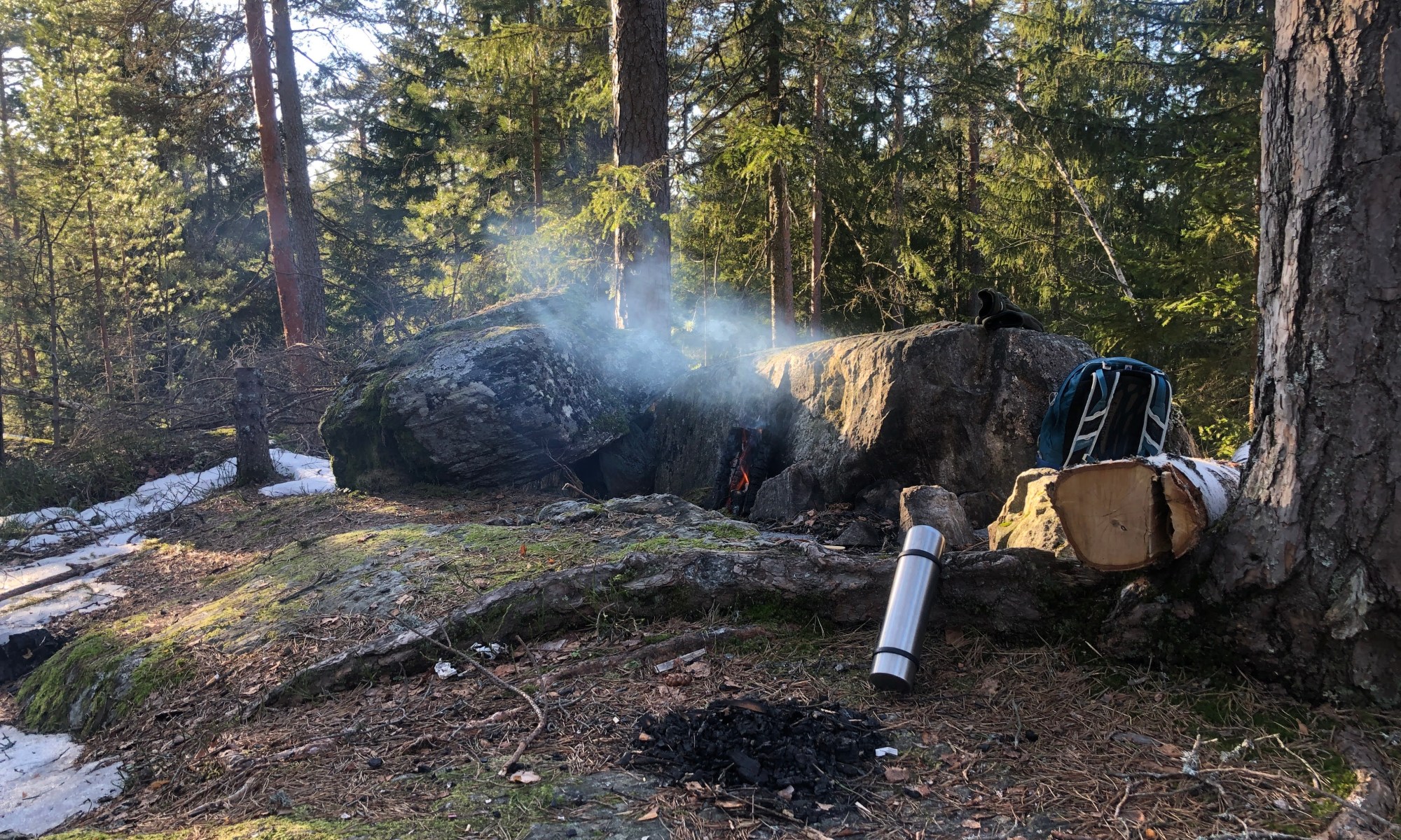 Det var ikke så langt jeg gikk i dag heller, men bare det å komme inn mellom trærne et par timer gjør godt, og kaffen og kvikk-lunchen smakte godt der jeg satt i sola, med et lite bål ved siden av.