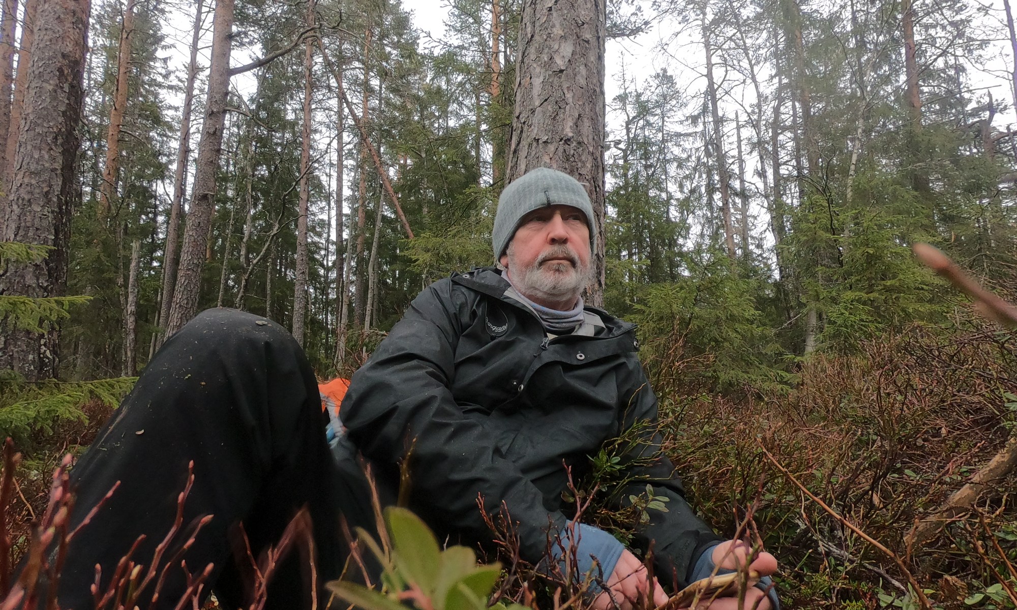 Krysset stien og gikk inn i fint skogsterreng. Plundret litt med å finne kameraet, men fant det etterhvert. Der tok jeg dagens kaffestopp. Med regntøy var det deilig å bare sette seg ned i den våte lyngen.