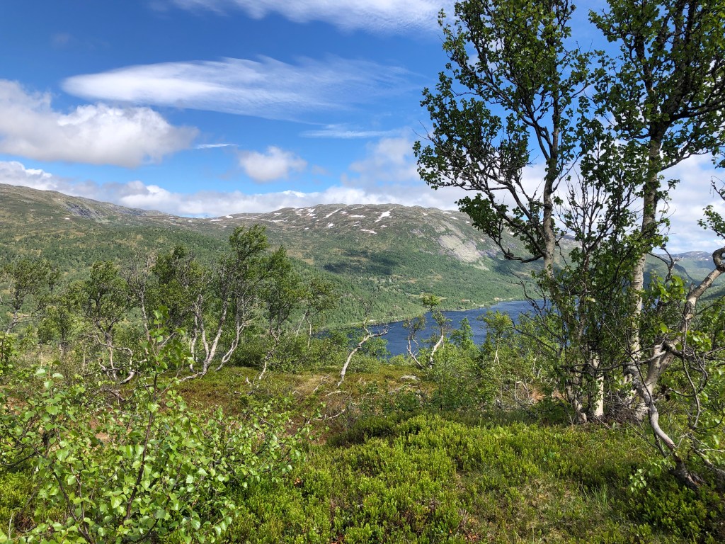 Derfra et det fin utsikt i alle retningen, alt fra snøkledde fjell og grønne åser. Rett under nuten ligger Bjørnevatn (bilde øverst)