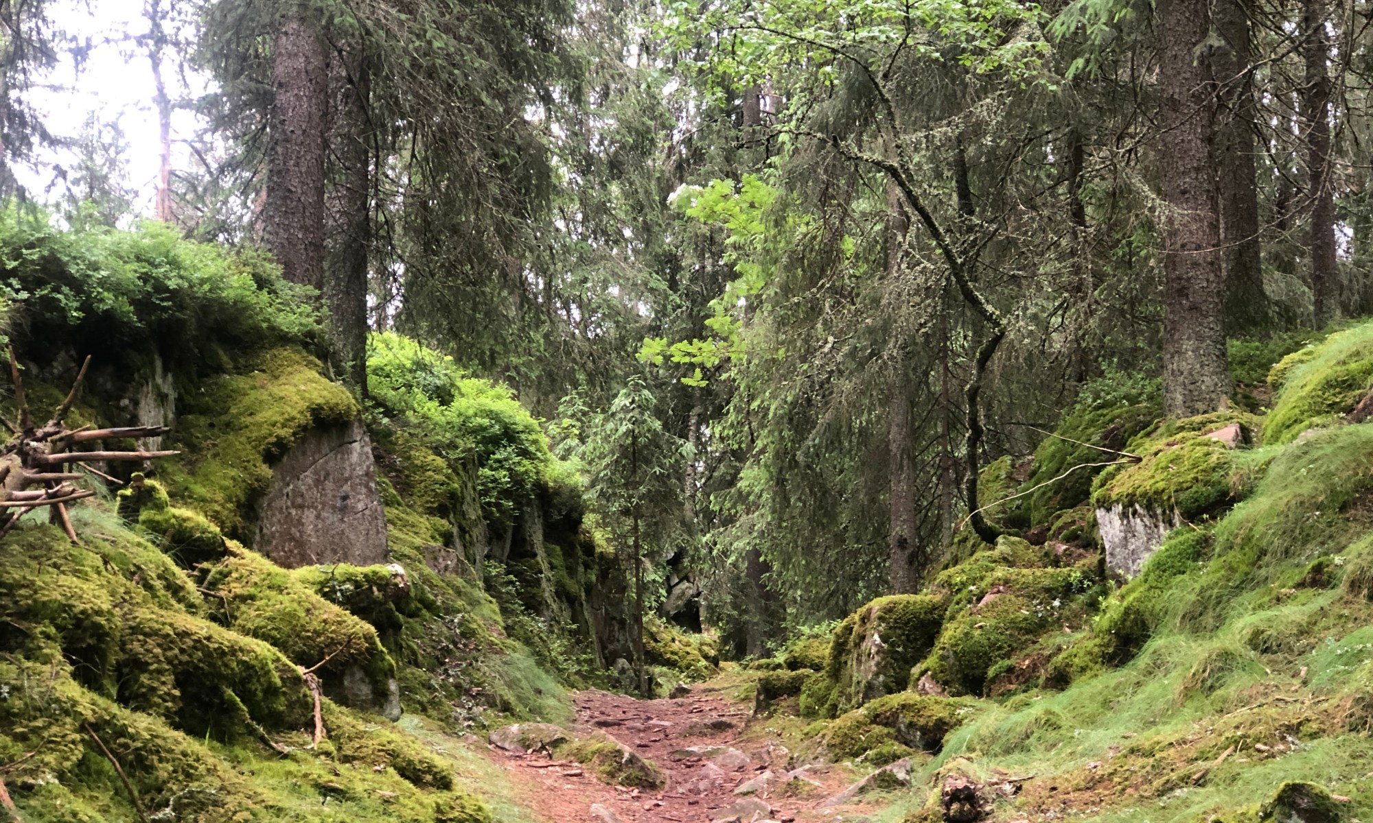 Utrolig fint og grønt i skogen nå, noe dette bildet viser.