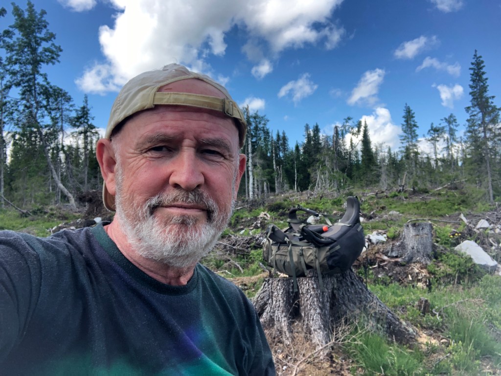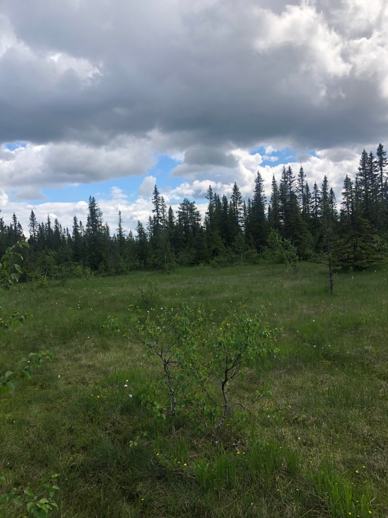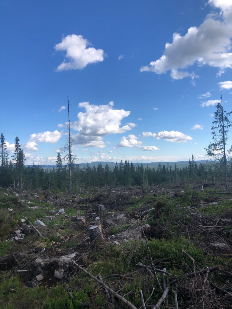 Nå har jeg satt opp teltet i utkanten av et hogstfelt, oppe på en liten ås. Selv om det lufter godt her er det mye fluer, mygg og klegg. Får komme meg inn i teltet etterhvert!