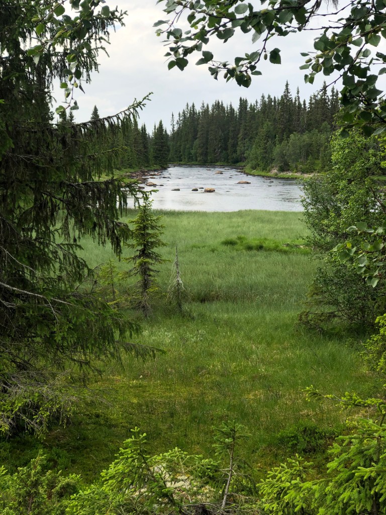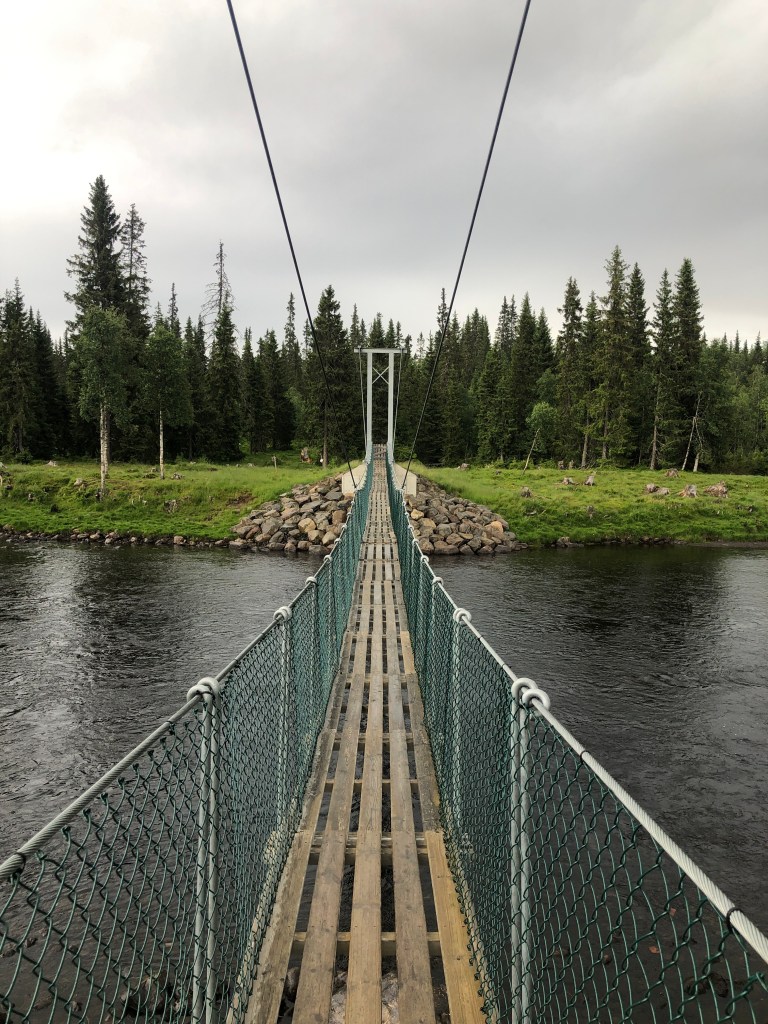 Derfra gikk det nedover i lett terreng, og noen hundre meter på skogsbilvei før ny sti over en topp og ned til Åstaelva. Passerte denne på fin hengebru.