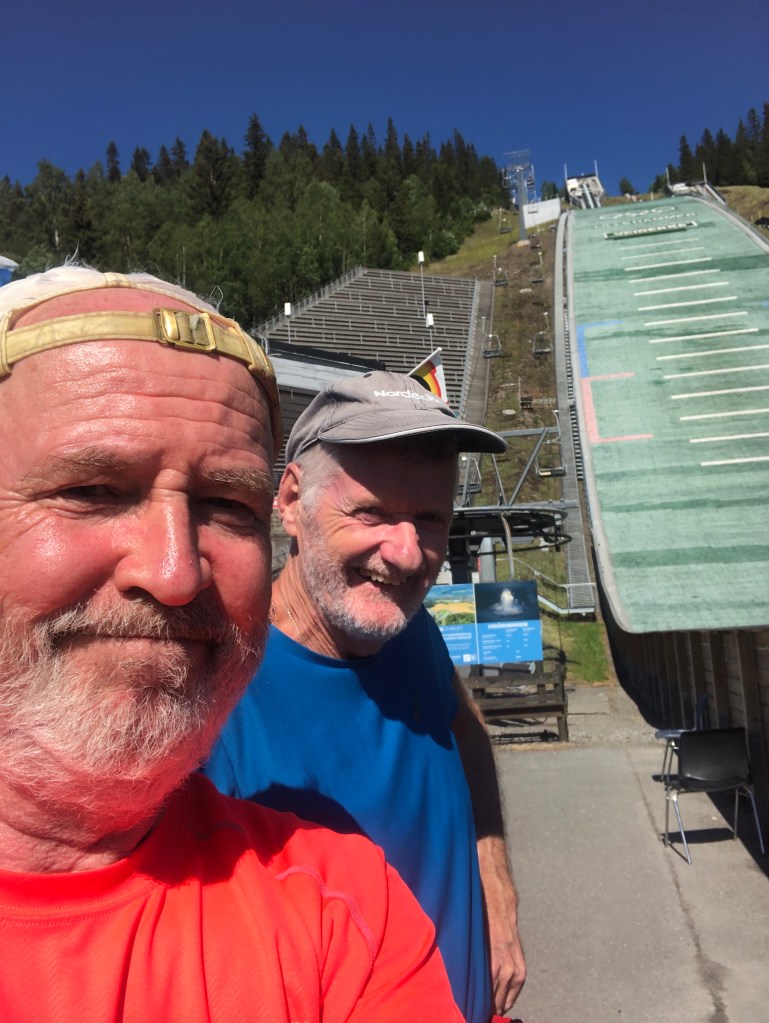 Avsluttet turen i trappene ned Lysgårdsbakken, og midt i trappen møtte jeg min gode vennlig og tidligere kollega Tore Vea. Vi hadde en hyggelig prat og han serverte kaffe, varme boller på terrassen. Han bor ikke langt fra hoppbakken. Det smakte skikkelig godt, Tore!