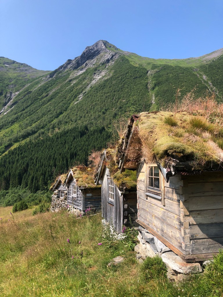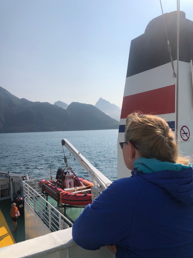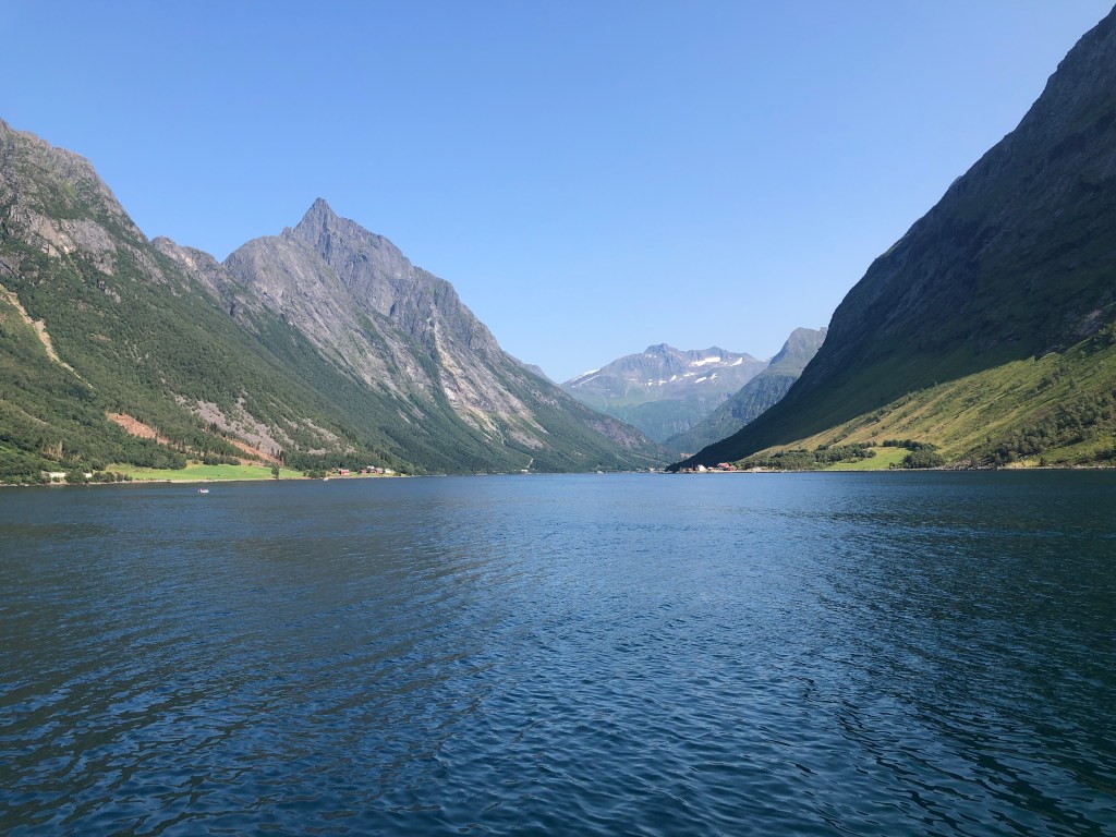 I strålende solskinn, nesten vindstille og fin sommertemperatur tok vi en tidlig ferje fra Sæbø over Hjørundfjorden til Lekneset.