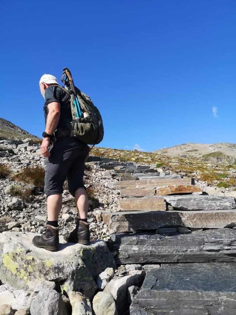 Det er mye løs småstein på stien, så det gjelder å gå forsiktig både oppover og ikke minst nedover. I noen partier er det laget sherpatrapper.