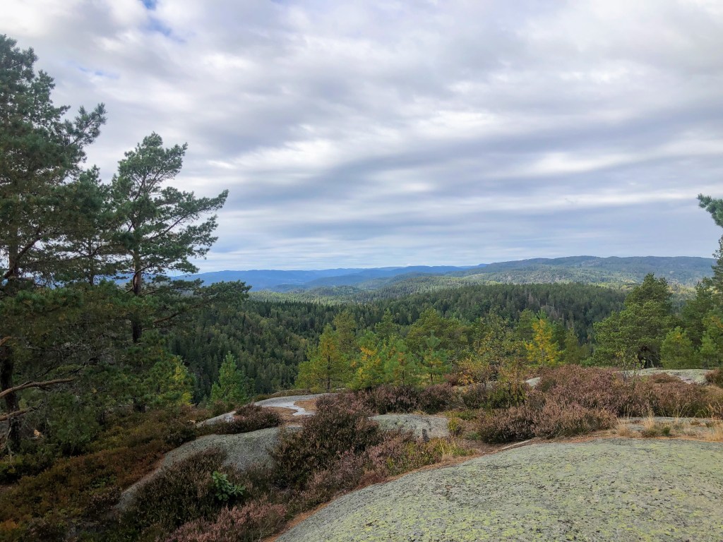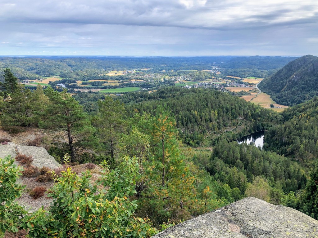 Der fikk vi endelig en fin utsikt. Derfra ser man langt øst, sør og vestover i klarvær. I dag var ikke sikten den beste, men vi så langt allikevel, blant annet til Oslofjorden og oppover til masten på Vealøsfjellet.