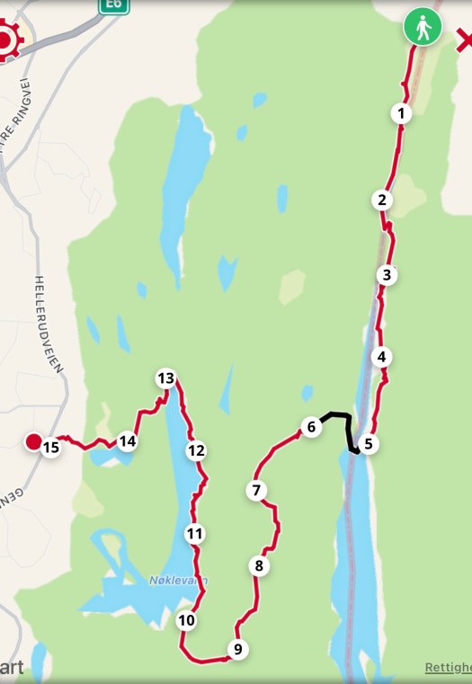Etter et kort stopp ved Mariholtet Sportsstue gikk jeg på skogsbilvei i retning Nøklevann, men tok av på stien langs Slettfjell og ned til Høyås. Denne stien går et et veldig fint terreng.