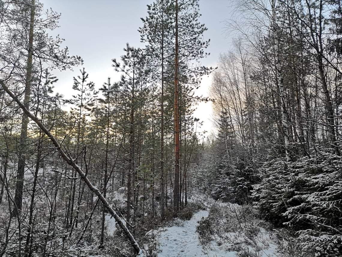 Bedre å gå i terrenget i strømgata enn på veien, så vi dro i vei. Luna snuste og svinset rundt, og satte tydelig pris på en tur i skogen. Ved Postmyra tok vi av til høyre og opp forbi Låkelia og videre opp til bjørnehiet. Det er fint og lett kupert terreng, det er bare så vidt litt snø og is enda, men flott og gå.