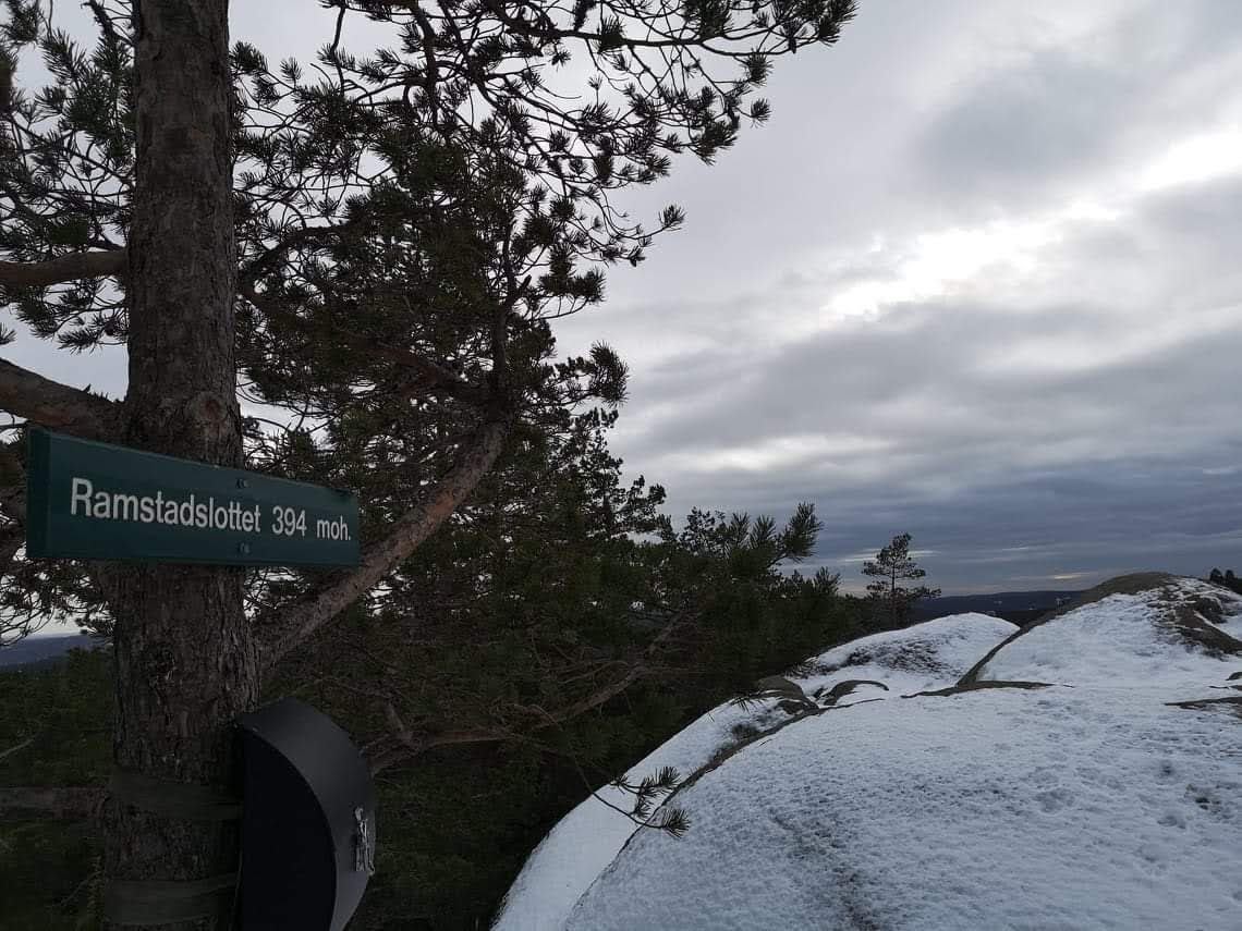 Tok så av på blåsti innover og opp til Ramstadslottet (394 moh). Siden det blåste ganske friskt i dag, ble det første kaffestoppet inne i skogen, før den luftige toppen. Solen som var fremme fra starten av turen, forsvant etterhvert bak skylaget, og på toppen blåste det godt.