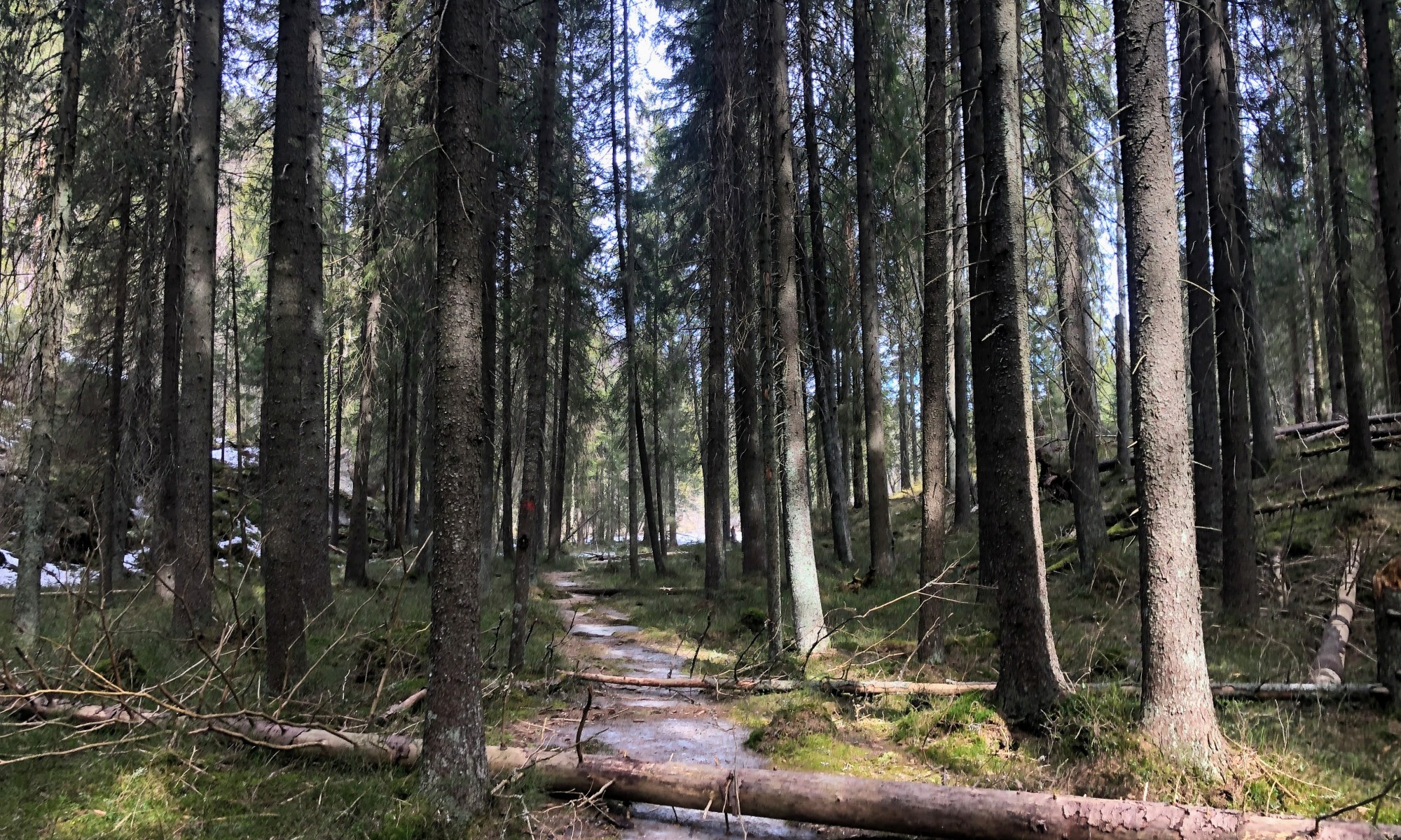 Oppe på åsen tok jeg av fra stien og gikk innover i fin skog. Det blåste litt, og det er fortsatt litt kaldt, men når sola kom frem ble det fint.