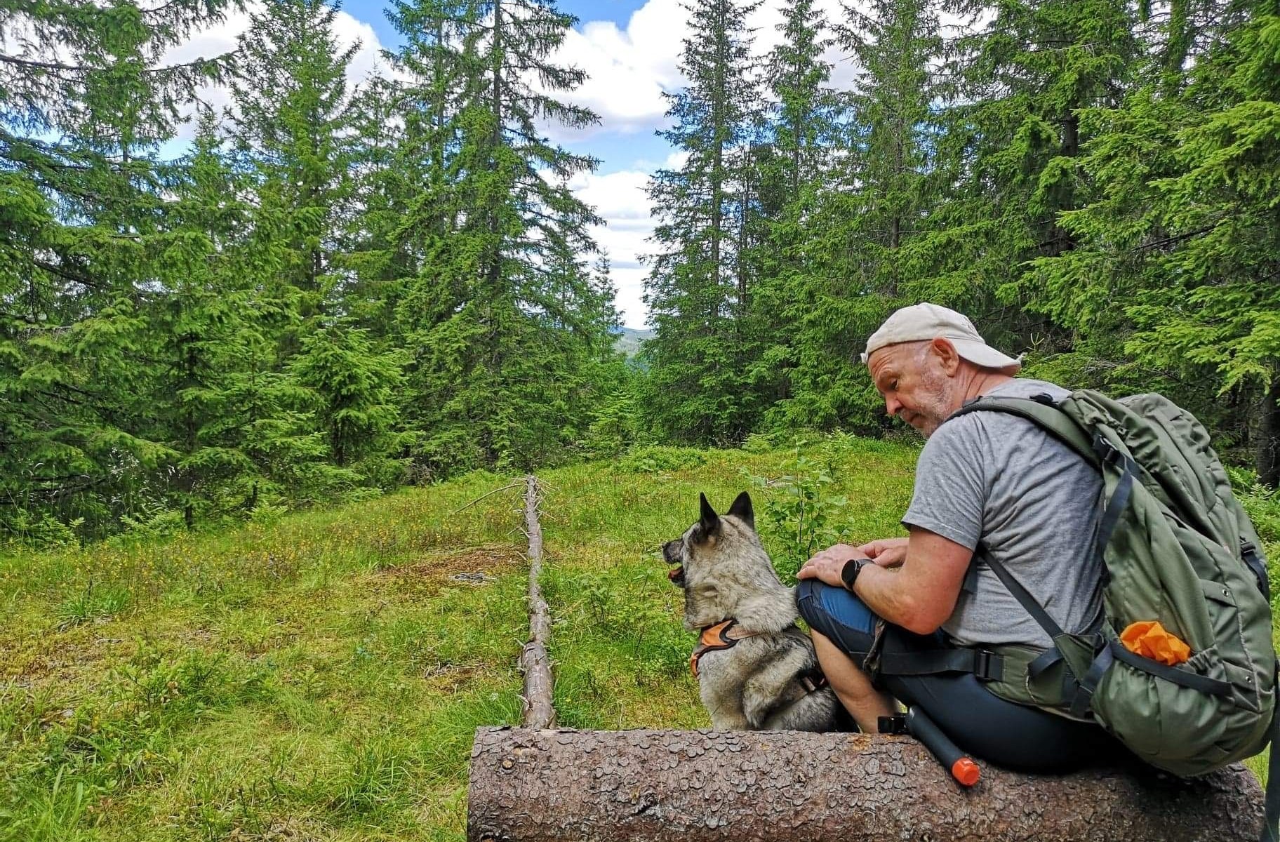 Fulgte stien videre nedover til Musebu i Svenskedalen, en falleferdig hytte som ble bygget for anleggsarbeidere som skulle lage vei over til Sinober. Denne veistrekningen ble det aldri noe av. Er usikker på hvilket år, men fant aviser fra 1990-tallet på gulvet i hytta. Er nok bygget en stund før det. Derfra fortsatte vi opp til Brennberget (441 moh og Lillomarkas høyeste punkt) hvor vi spiste niste og drakk kaffe. Det smakte godt i sola.