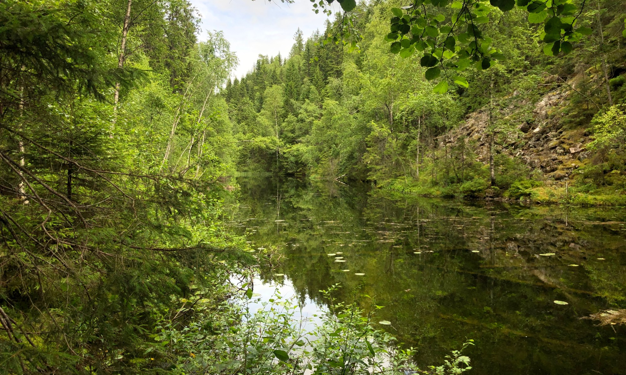 Fulgte et tråkk langs bekken fra tjernet, og kom etterhvert inn på stien igjen. Derfra gikk det litt på kryss og tvers, før vi kom ned på skogsbilveien. Fulgte den ned til Grytebekken og derfra opp til Solemskogen. I grøftekantene er det mye markjordbær nå, og de er gode.