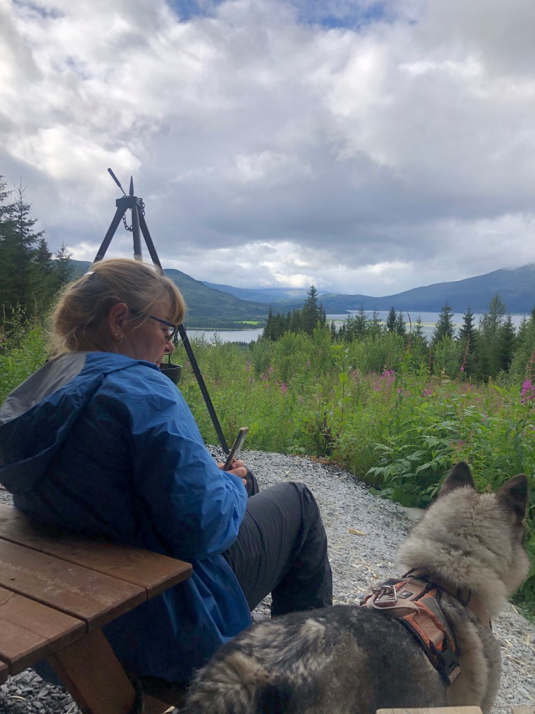 Vi har ikke vært heldige med ferieværet så langt. Det har vært mye gråvær og regn i dag også. Vi er fortsatt på Bjerka. Vi startet dagen med en solid frokost med egg og bacon hos Hedvig, en kollega av Gry. Hedvig har vært med på tur flere ganger, men har nå flyttet hjem til Bjerka, så det er hyggelig å hilse på henne igjen.