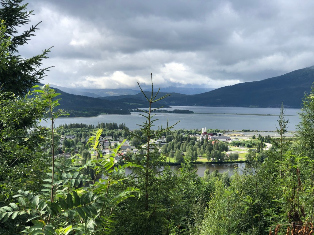 Fra gapahuken, som ligger på ca 140 moh er det en fin utsikt ned mot Bjerka, utover Sørfjorden og over mot Hemnesberget.