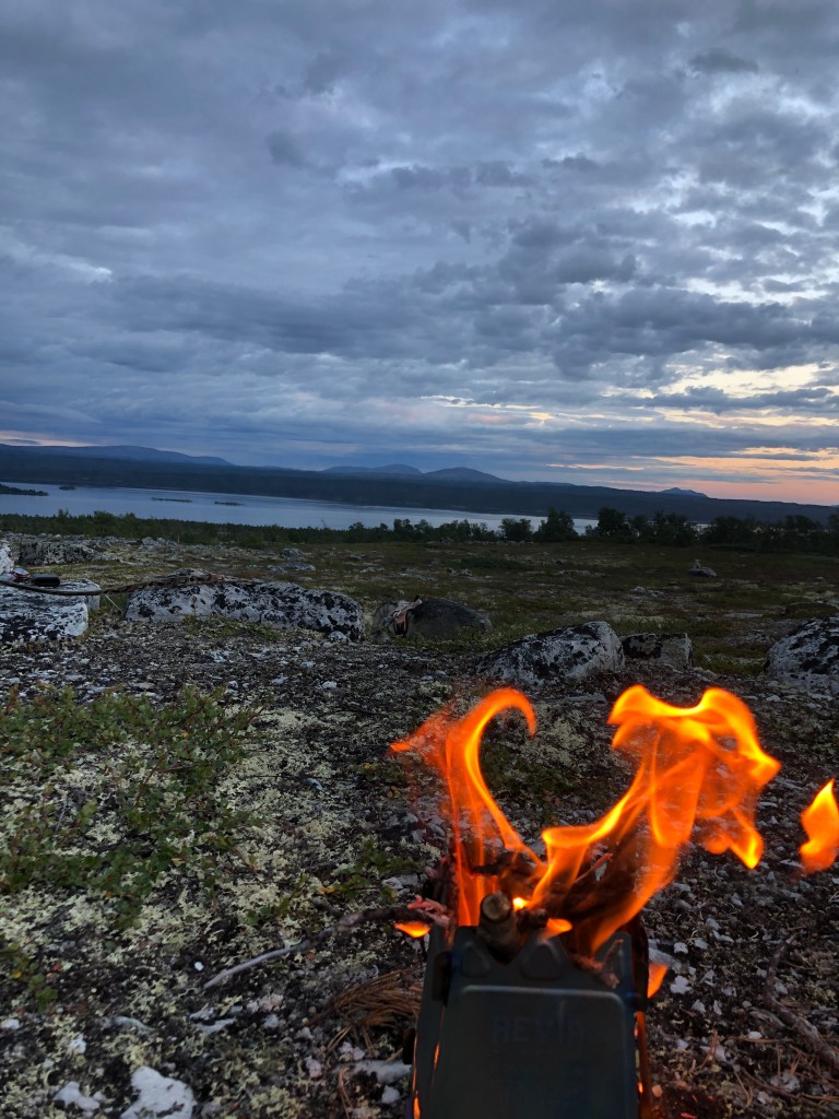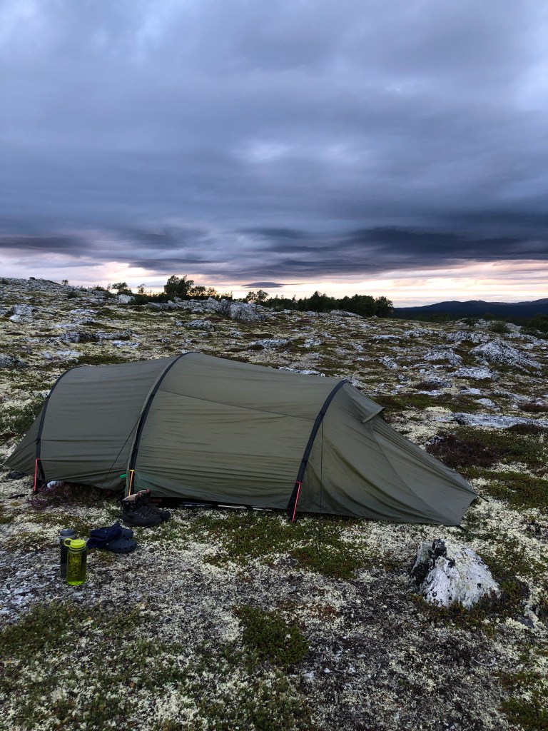 Da er den fjerde dagen, og turen, ved Femunden over. Vi hadde tenkt å ta en tidlig kveld i går, men det ble en så fin kveld at vi ble sittende utenfor teltet. Der vi teltet var det vindstille og fint, men i det fjerne så vi enkelte regnbyger passere. Nede på Femunden lå vannet speilblankt.