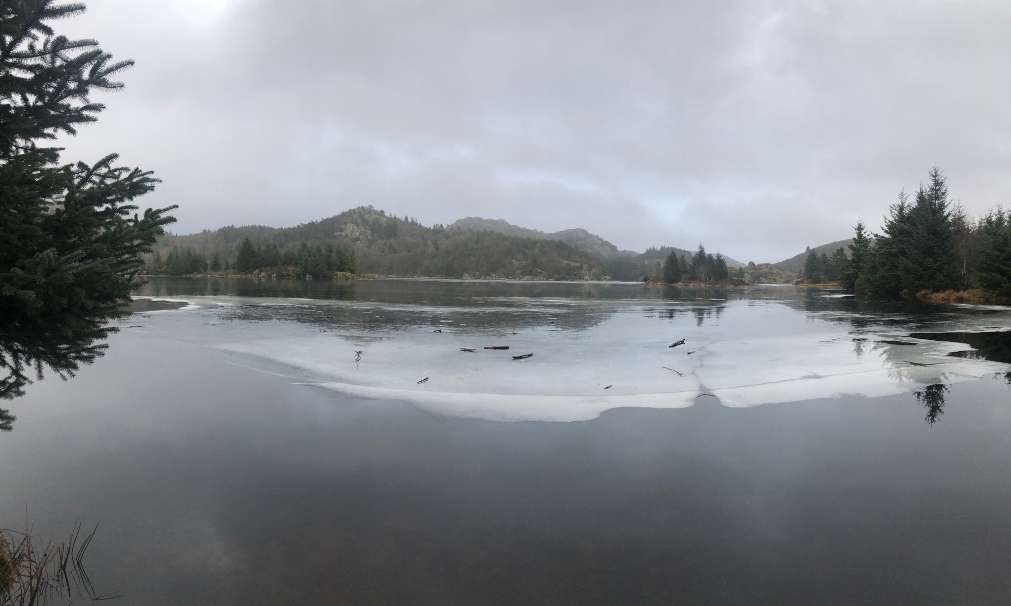 Første stopp ble ved Kleivlandsvatnet. Etter mildværet den siste tiden er det nå nesten isfritt der. Ingen sol i dag, men lyset er flott ute selv om det er grått. Etter ett lite stopp, ruslet vi videre på veien, langs vannet, og gikk inn mellom Breifjellet og Revfjell, og rundet Breifjellet på vei tilbake.