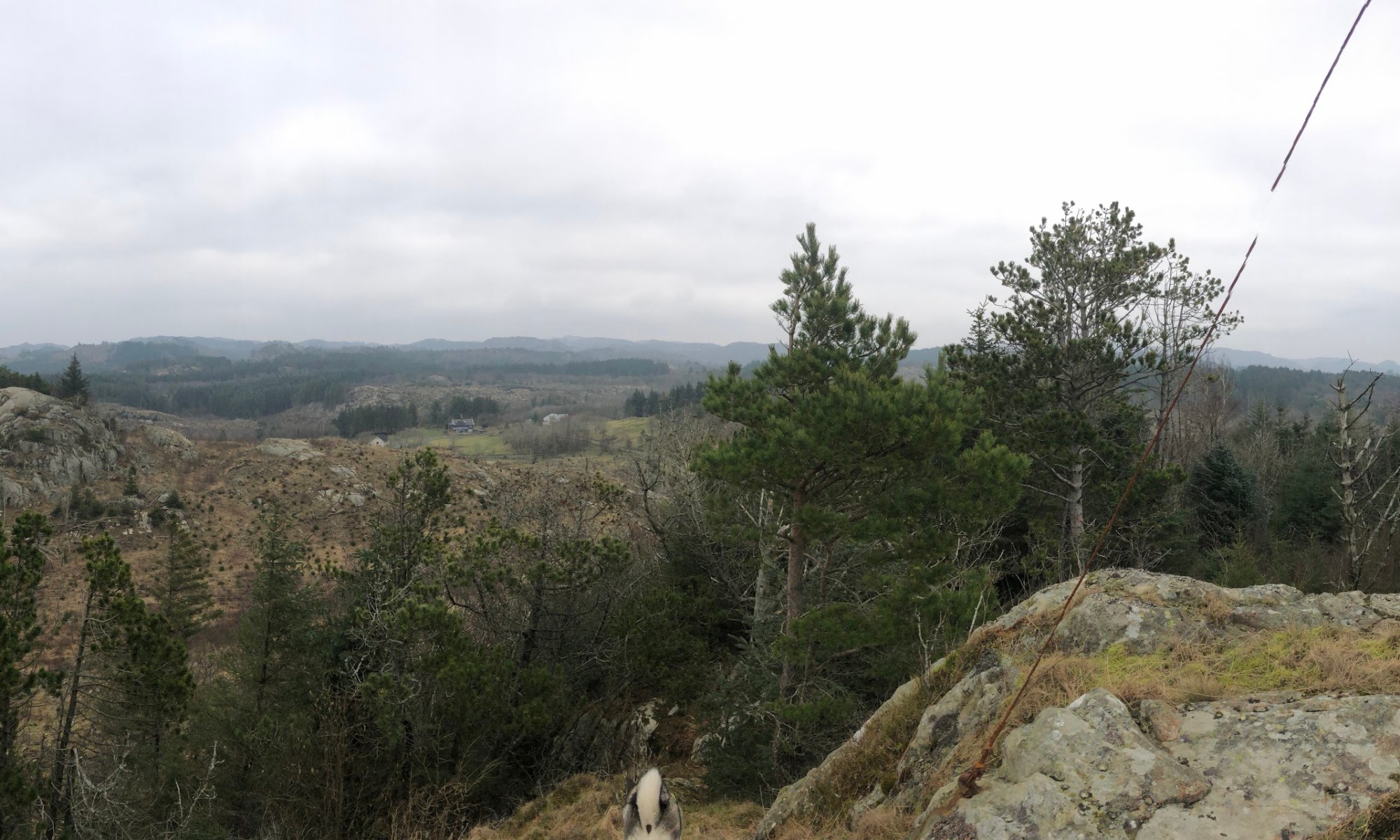 Vi gikk derfor litt på måfå, men kom etterhvert opp på åsen, som ligger på ca 80 moh. Derfra var det utsikt over hele Listalandet. Fra samme punkt så jeg der vi bor, Vanse, Lista fyr og ellers langt i alle retninger.