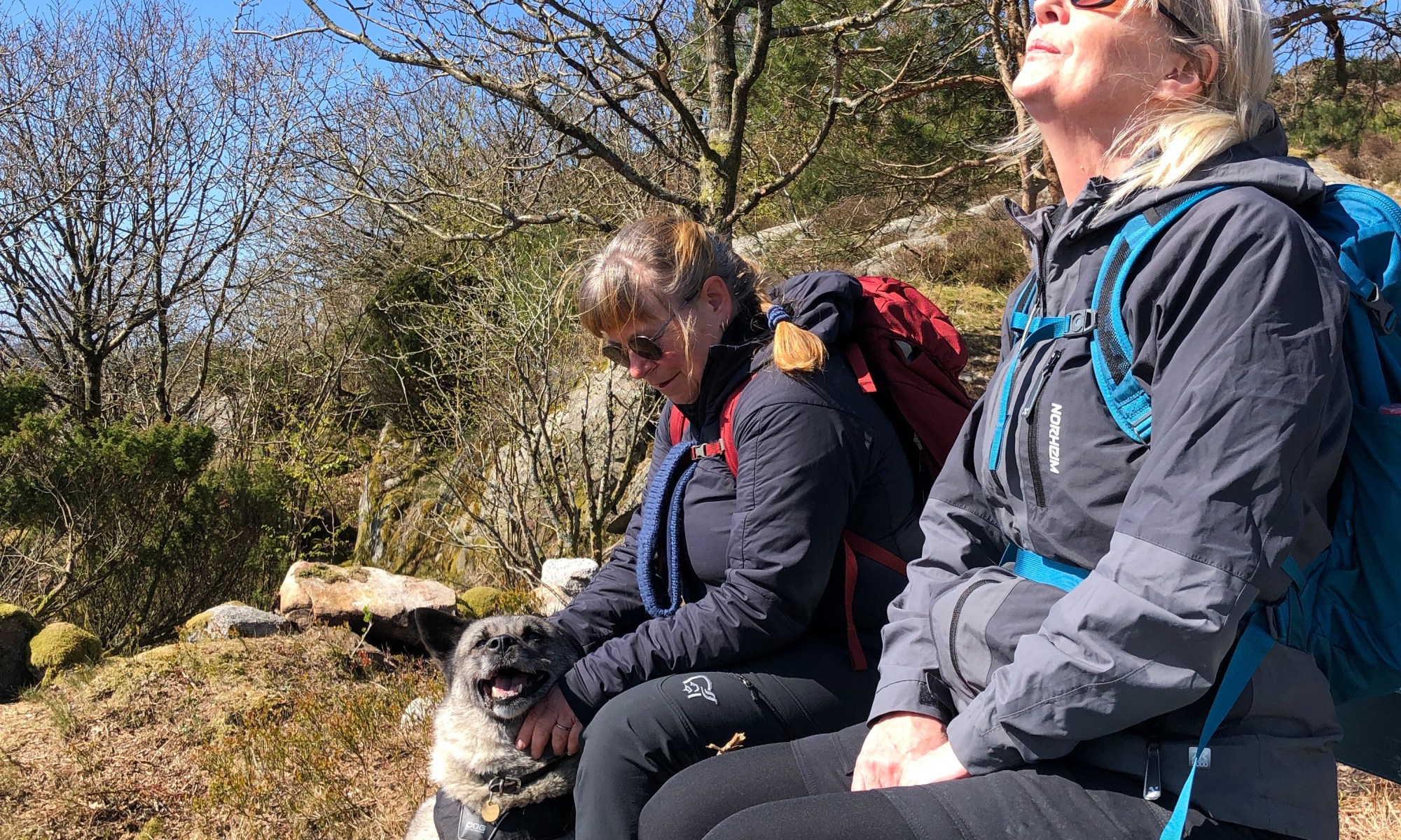 Denne helga har vi besøk av Grys venninne Vera fra Oslo. Vera er fra Valderøya utenfor Ålesund, så kysten her minner om hennes hjemsted. Vi startet turen i dag fra parkeringsplassen ved nedkjøringen til Loshavn, og gikk den nyanlagte grusveien inn til dagsturhytta Havblikk på Kirkeskaret. Fantastisk utsikt her i dag, sola skinte fra blå himmel!