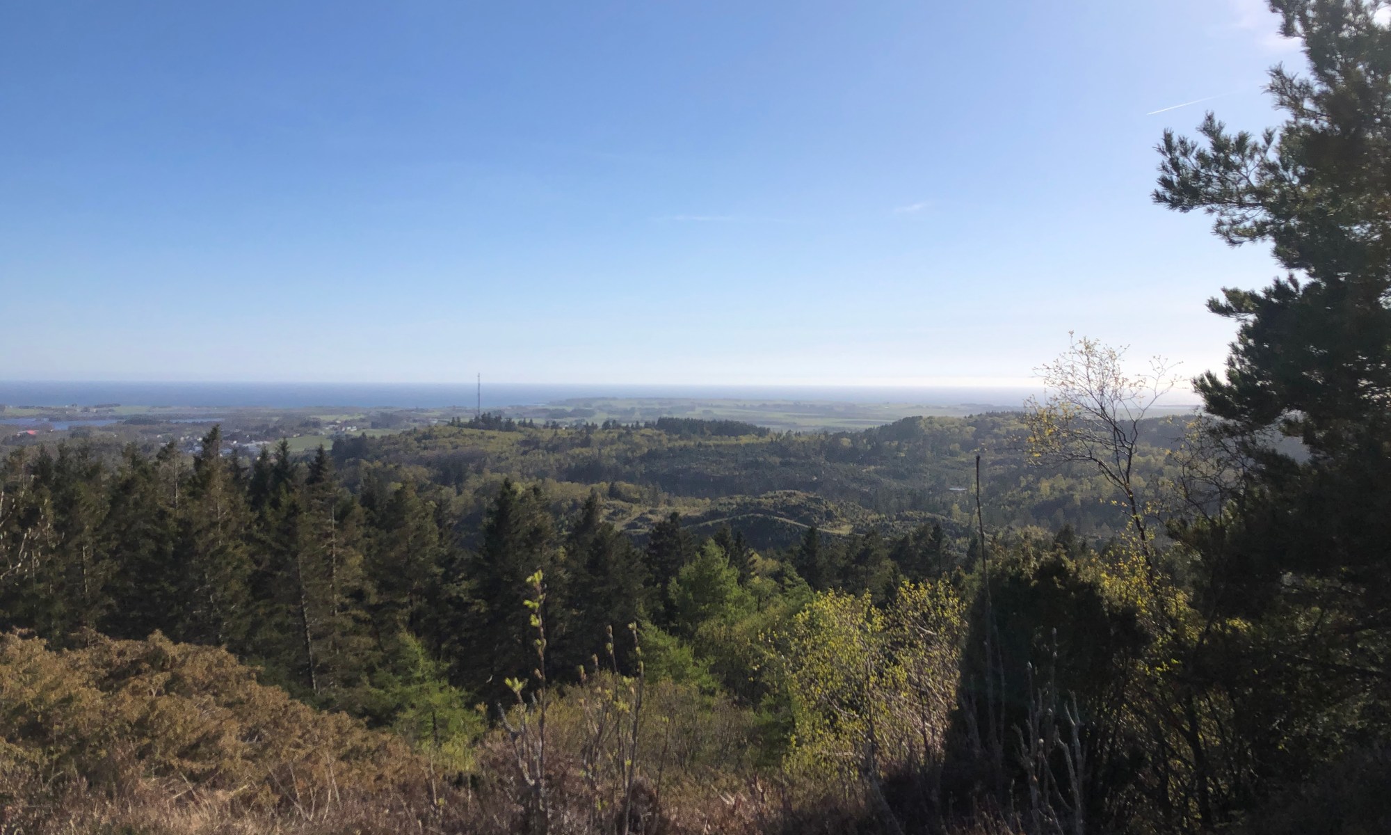 Etter dagens økt i hagen bestemte vi oss for å spise middag ute i det fri. Vi pakket tursekkene og kjørte inn til nordsiden av Vanse sentrum. Derfra gikk vi oppover til Utsiktspunktet Måned på Gaupeland. Ikke så lange turen, men det går jevnt oppover hele veien. Turen oppover går i fin gammel skog, og nå er blomstingen i full gang.