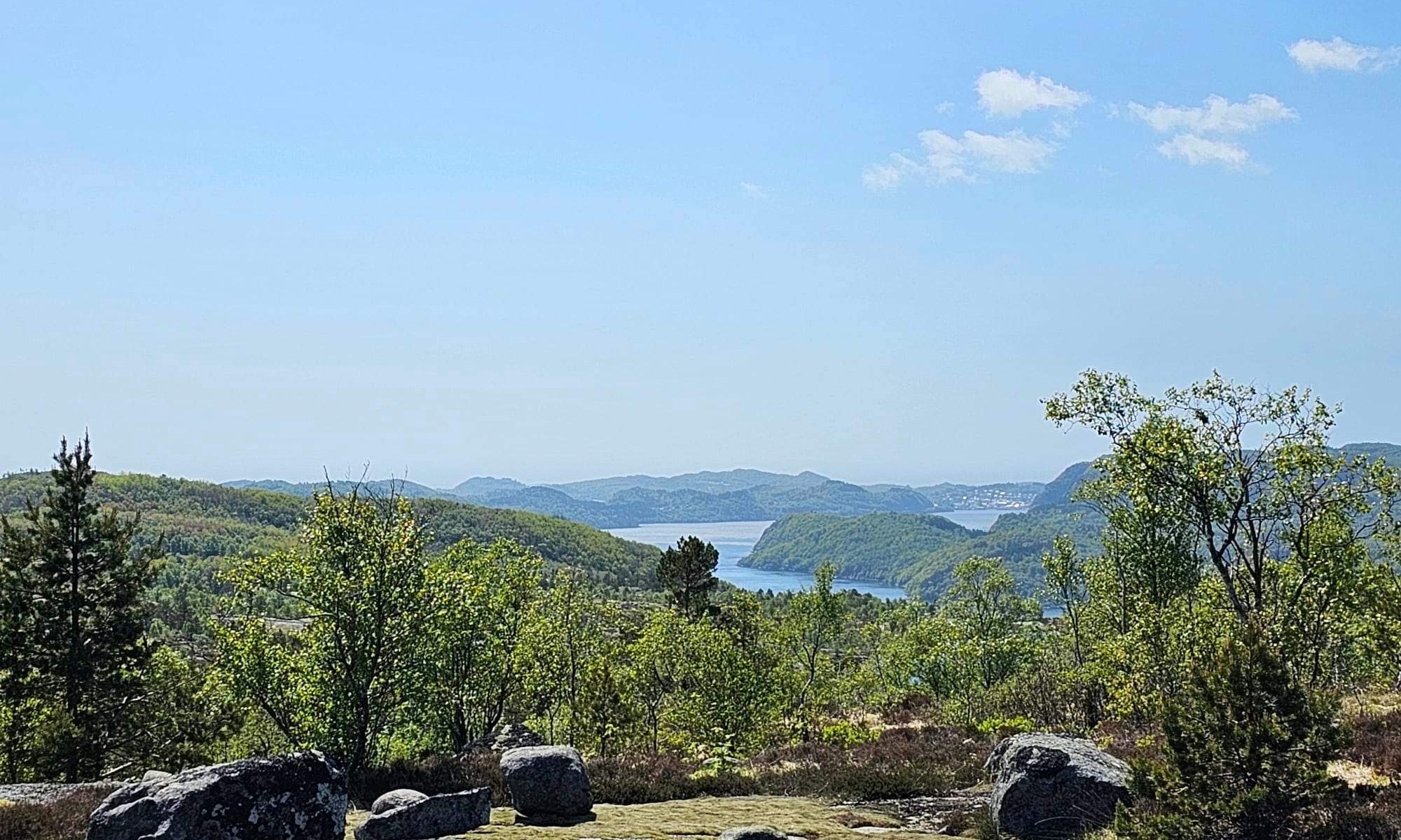 Vi oppdager stadig nye og fine turområder, i dag i nabokommunen Lyngdal. Etter en kjøretur til innerst i Lyngdalsfjorden og litt sydover fjorden på nordsiden, kjørte vi på smal og stedvis bratt vei til Skrelia. Der startet dagens tur i strålende solskinn. Dette er tydeligvis et populert turområde, for det var så og si fullt på parkeringsplassen. Vi møtte imidlertid nesten ingen på vår rundtur, så det er nok flere alternative stier i dette terrenget.