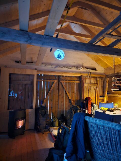 Etter en deilig middag med sjømat og grønnsaker er vi nå klare for den første natten her i naustet.