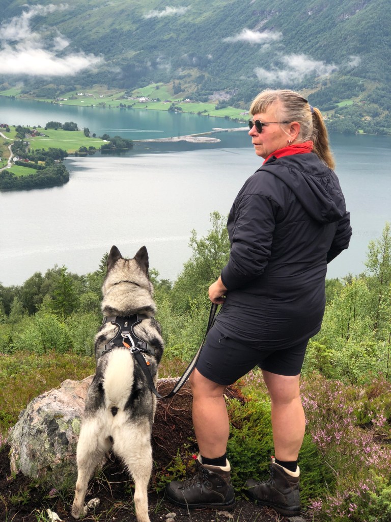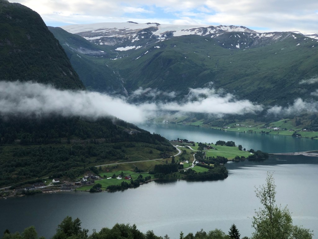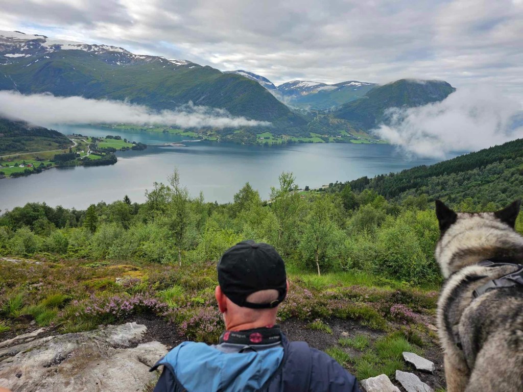 Derfra hadde vi utsikt ned til Jølstavatnet og fjellene som omkranser Skei i Jølster. Vi så også litt av Jostedalsbreen.