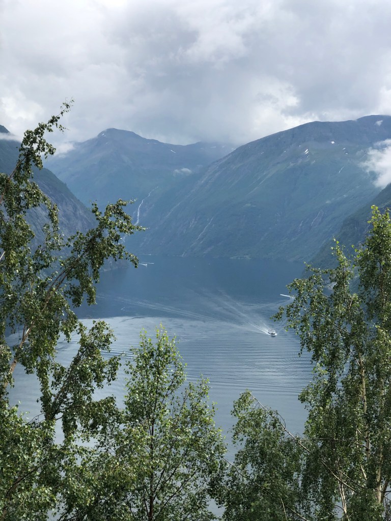 Det smakte godt med en solid frokost da vi kom ned igjen, og så var det bare å pakke og komme seg videre nordover.Tok et stopp over Hellesylt i Geirangerfjorden. Fantastisk utsikt ned til fjorden.