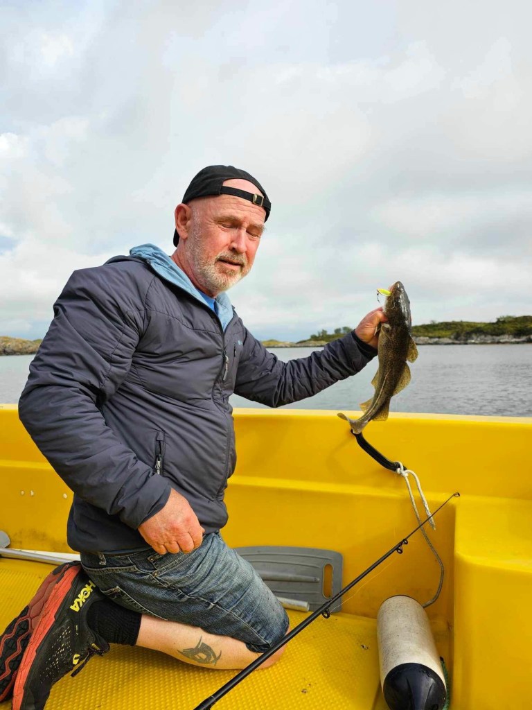 Har allerede tatt noen kast med fiskestanga og fikk en fin torsk.