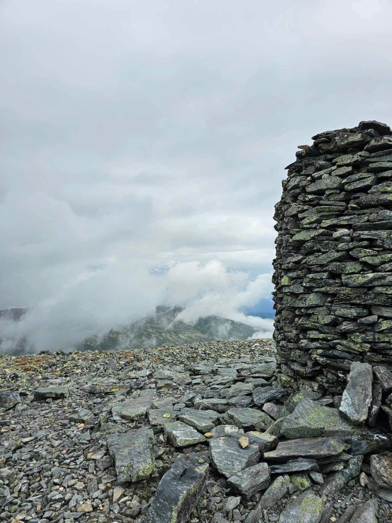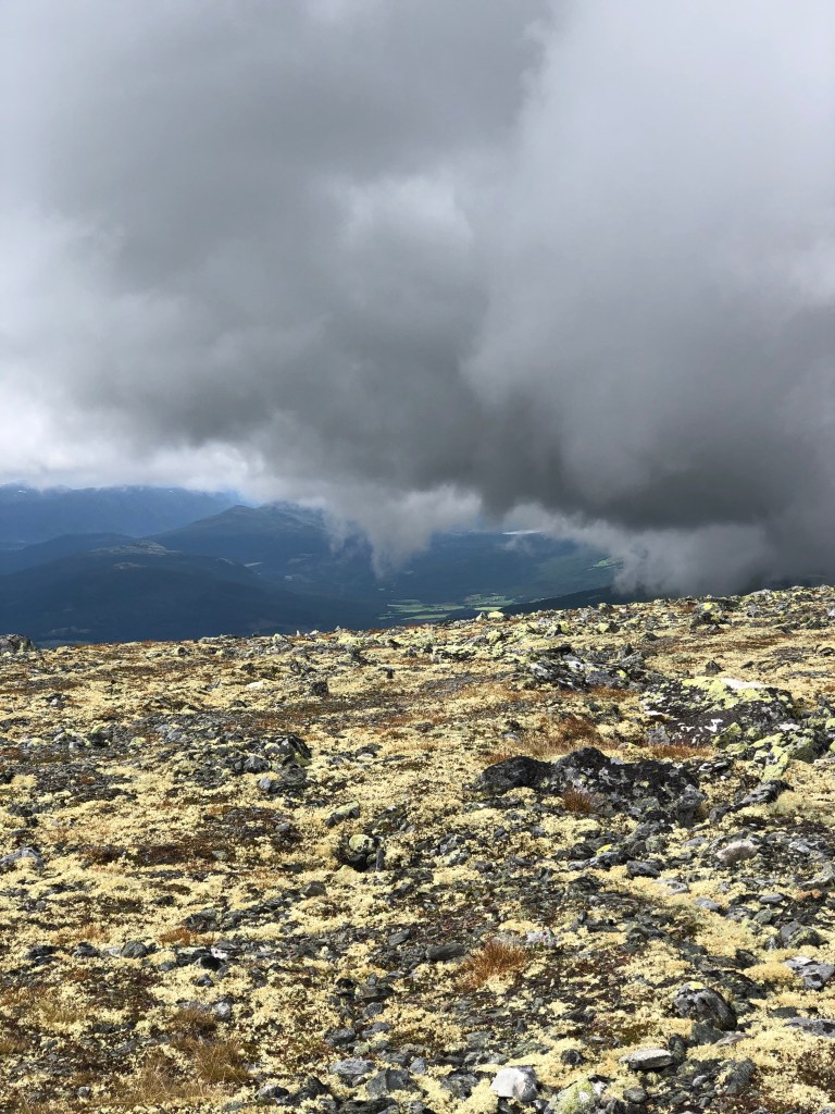Oppholdsværet varte imidlertid ikke lenge, for i der vi var oppe ved varden på Heidalsmuen( 1745 moh) kom mørke skyer sigende rett over toppen og regnet startet på nytt.