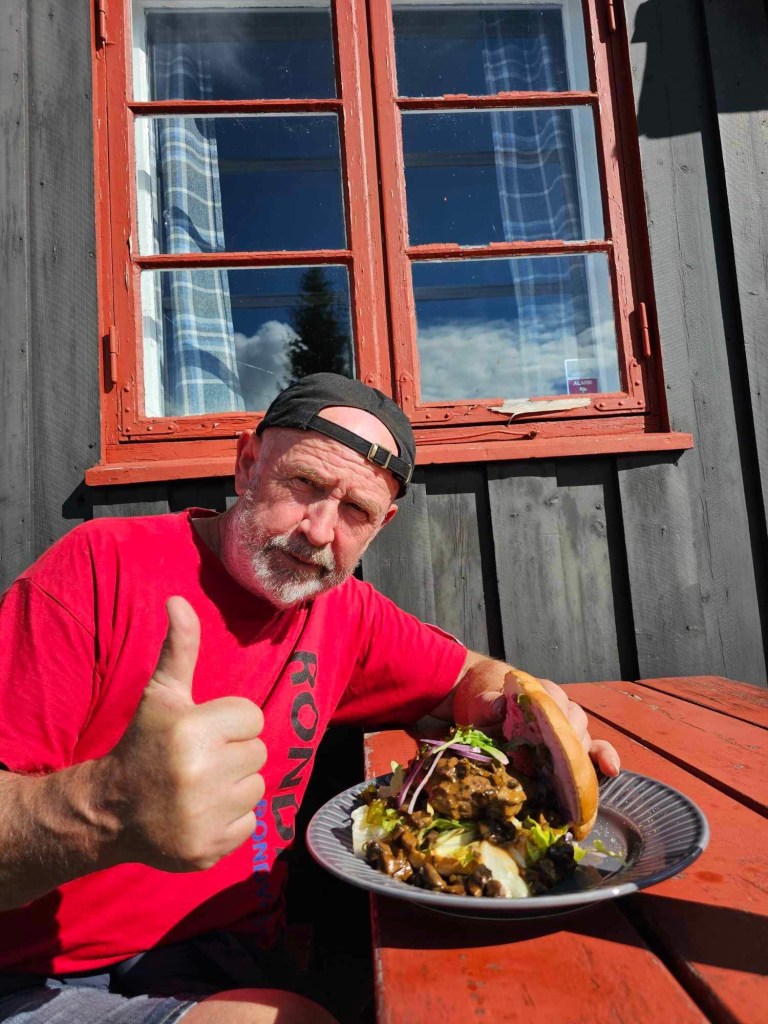 Det smakte godt med en solid elgburger med soppsaus da vi kom ned igjen!