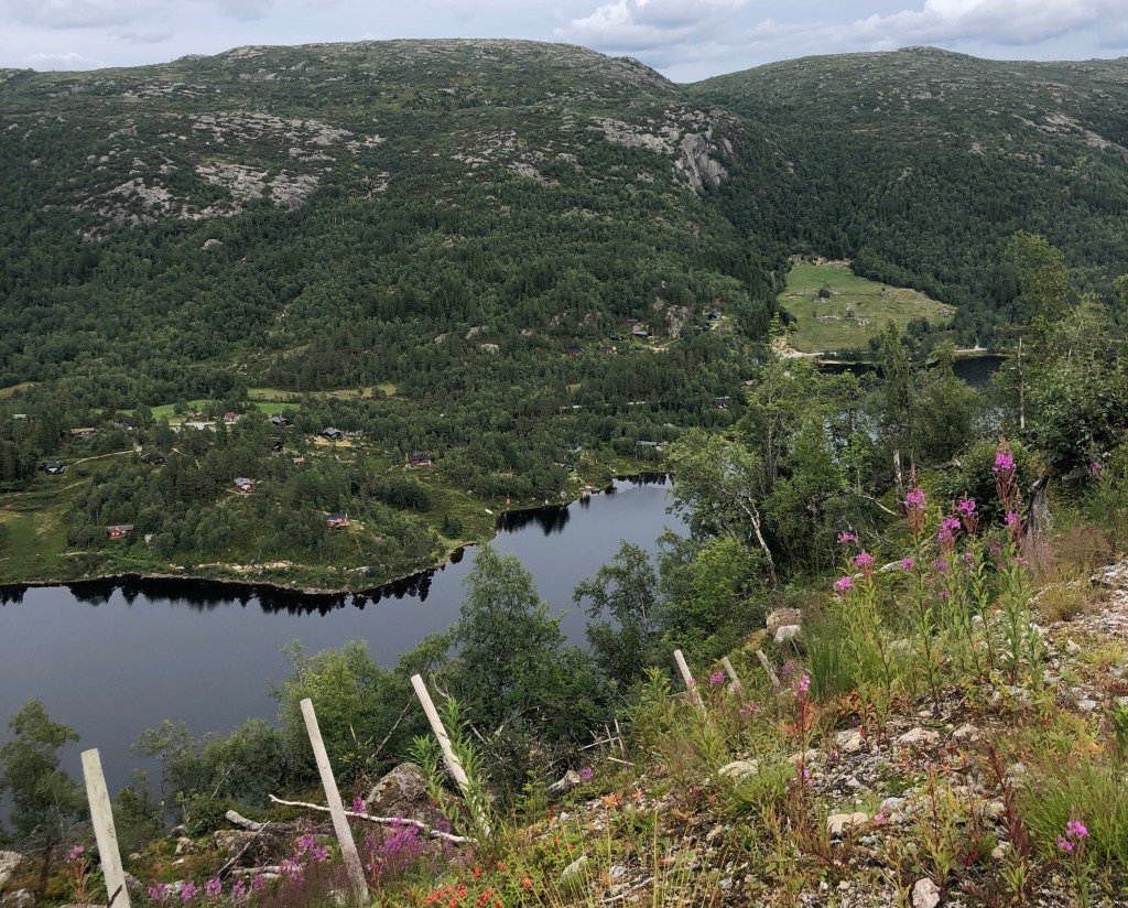 Før middag tok Tara, Tone, Gry og jeg en liten tur i hyttefeltet her oppe, og fant et fint utsiktspunkt ned mot sentrum av Ljosland og Ljoslandsvatnet 200 høydemeter under oss.