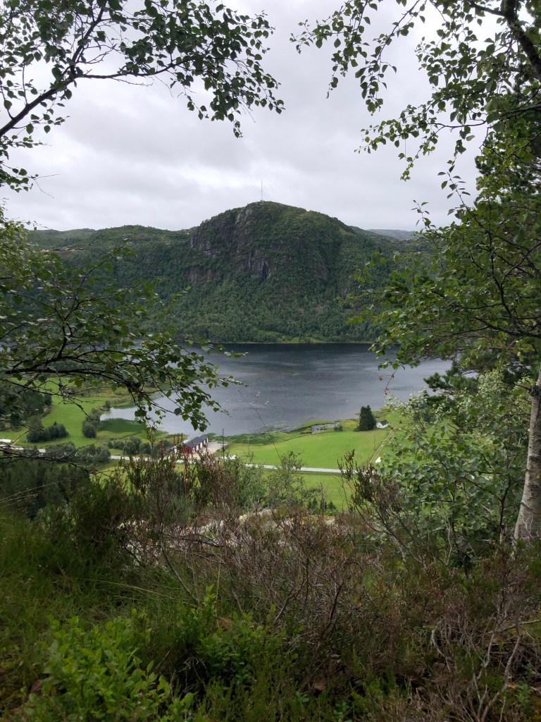 Halvveis nede gikk vi ut på et fint utsiktspunkt, og derfra så vi ned til Ljosland, Ljoslandsvatnet og videre vestover.