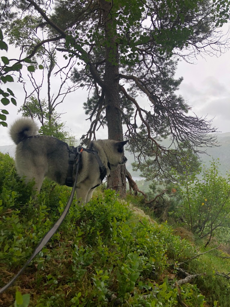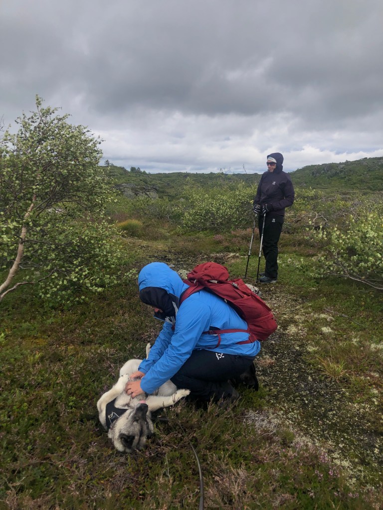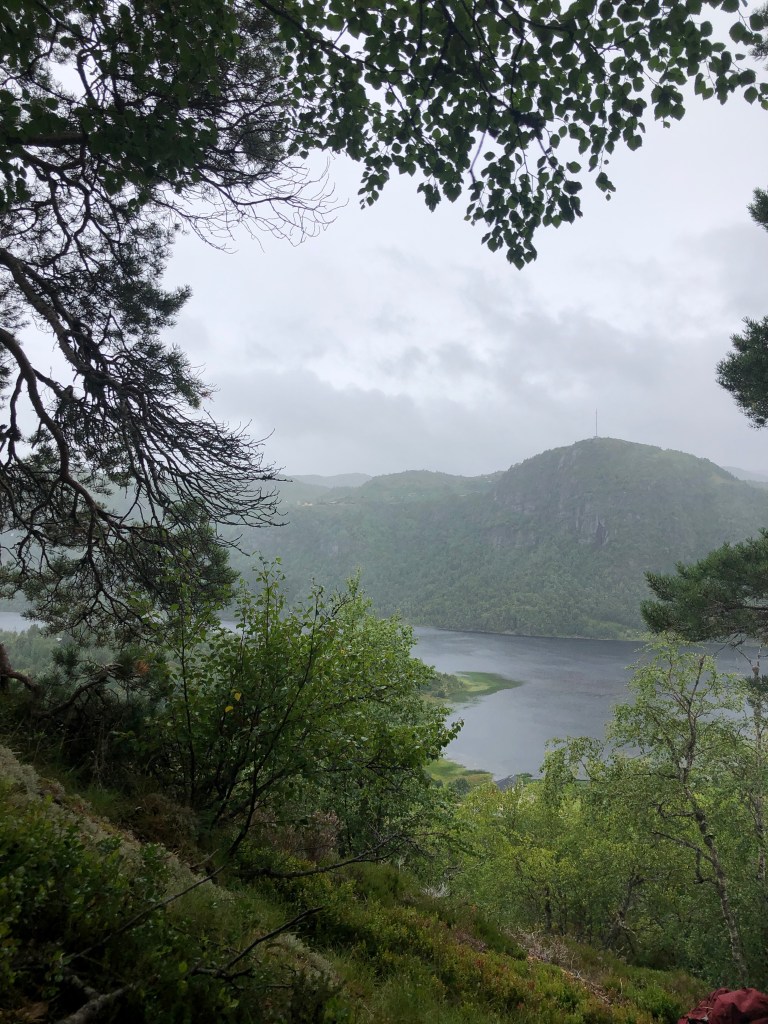 Rett før vi var nede igjen stoppet vi og plukket med blåbær, som vi koste oss med som dessert til middagen i dag. Som «vanlig» startet det å regne igjen i det vi var ferdige med turen.