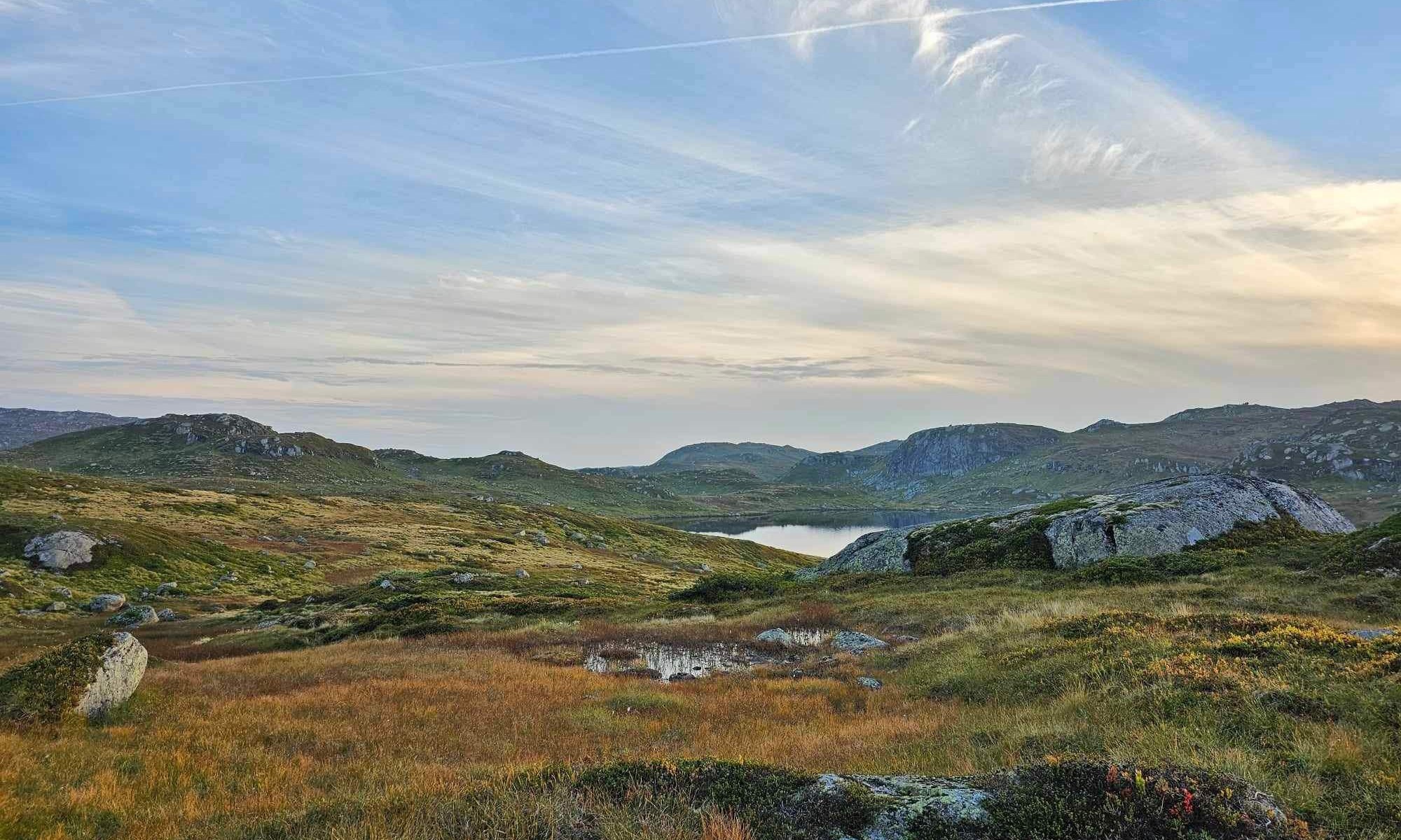 Etter en god natts søvn og frokost var vi klare for turen videre sørover. Vi pakket telt og utstyr og gikk i lettgått terreng. Vi fant en ny teltplass på sørsiden av Steinbutjørnin. Etter at teltene var satt opp igjen gikk vi en fin rundtur med lettere sekker. Vi hadde fantastisk utsikt i alle retninger, særlig fra de små toppene vi var oppom.