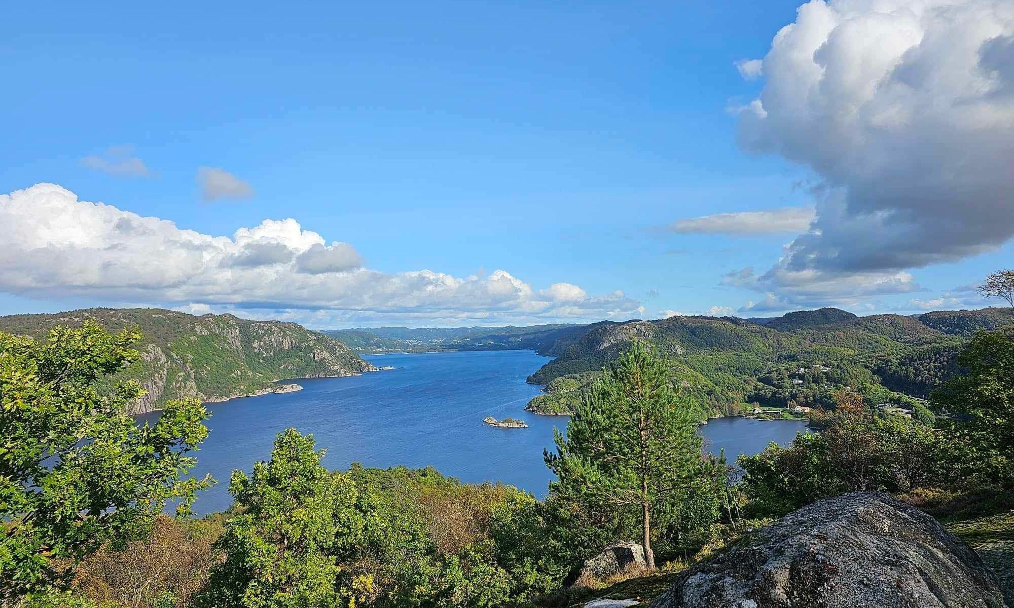 Vi tok en liten avstikker fra rundturen, det er bare noen hundre meter videre igjennom veldig grønt og flott terreng, så kommer vi til Tredalsfjellet. Her er det flott utsikt innover Lyngdalsfjorden.