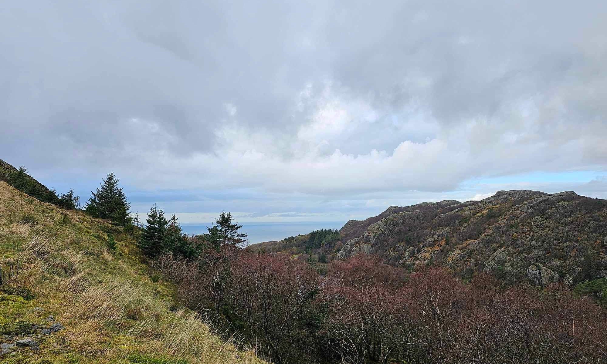 Det er ganske bra utsikt flere retninger, mot Hidra i tåke og videre utover.