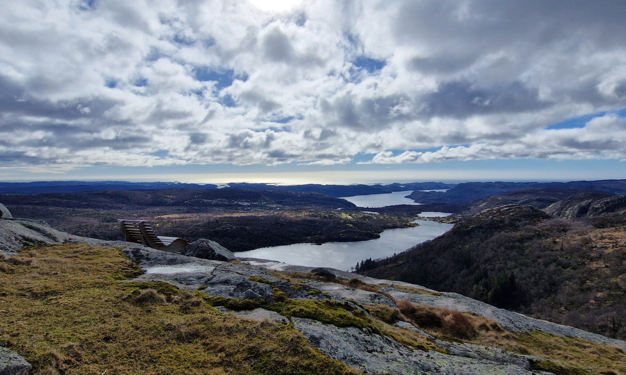Dagens tur gikk til Homsknipa, som ligger på grensen mellom Lyngdal og Farsund. Der har vi vært tidligere i varierende vær. Sist vi var der var det tåke og null sikt. I dag hadde vi fantastisk sikt fra toppen som ligger på 475 moh. Vi kunne se langt ut i havet.