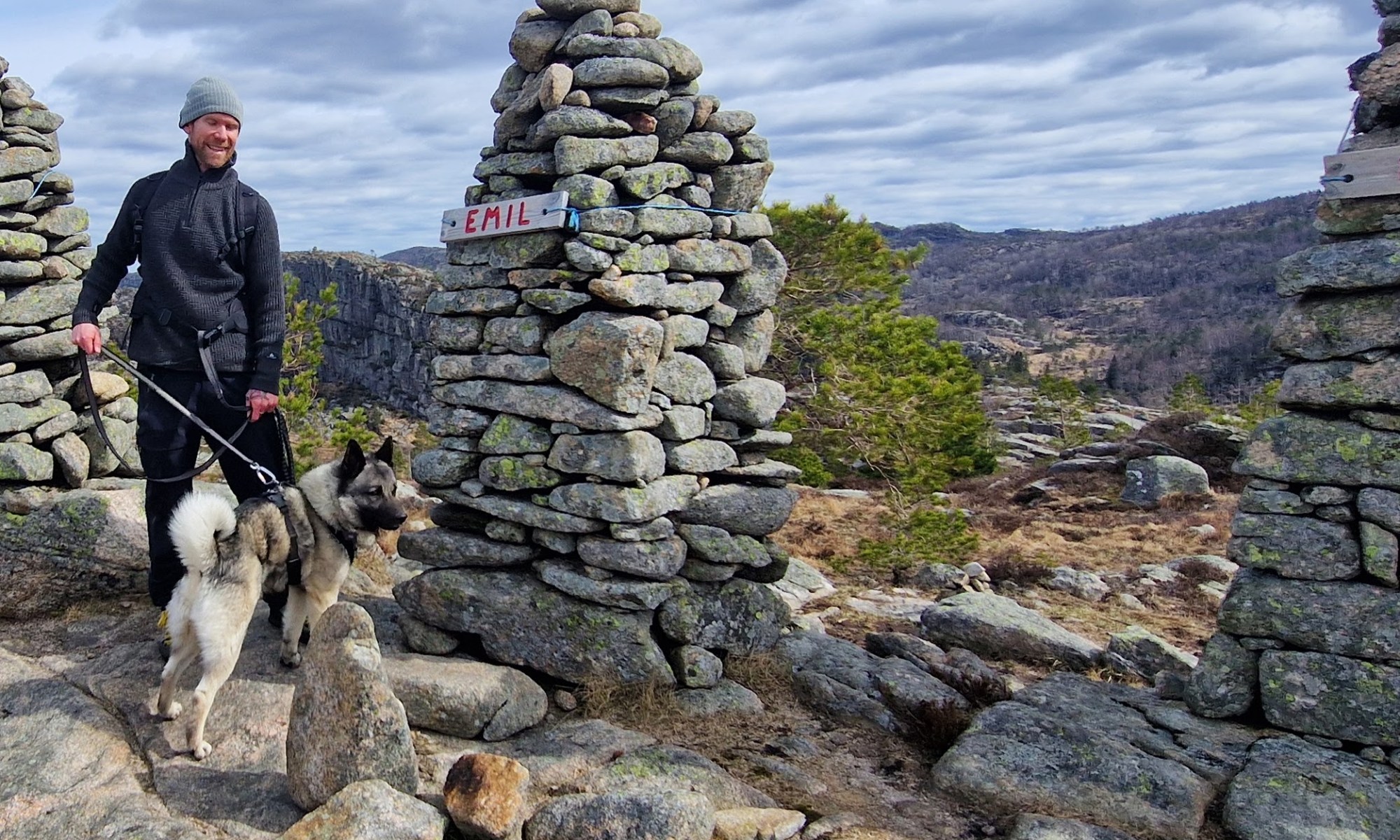 I går fikk vi besøk av min sønn Fredrik fra Bergen, og han skal være her til over helgen. Fredrik er også en ivrig turgåer, så etter frokost i dag dro han, Sid og jeg opp til Opofte hvor vi startet dagens tur. I litt overskyet, men OK turvær gikk vi en slak stigning opp til Åljersvatn. Videre innover langs vannet er det veldig lettgått på fjell og fin sti. Ved enden av vannet tok vi en kopp kaffe før den siste stigningen opp til de 3 vardene på Steinsheia. Fin utsikt der fra i alle retninger. Det ligger en høyde rett ved som er noen høydemeter høyere, så vi tok en tur opp dit også. Der var utsikten enda bedre.Sid syntes det var spennende med ny turkompis, og var aldri langt fra Fredrik.Det blåste litt kaldt på toppen, så vi ble ikke så lenge der oppe. Vi tok et stopp da vi kom ned igjen til vannet og lagde litt mat. REAL turmat er godt og enkelt å lage. Vi ga oss god tid på turen ned igjen. Nå er det bare å nyte våren og fin natur.