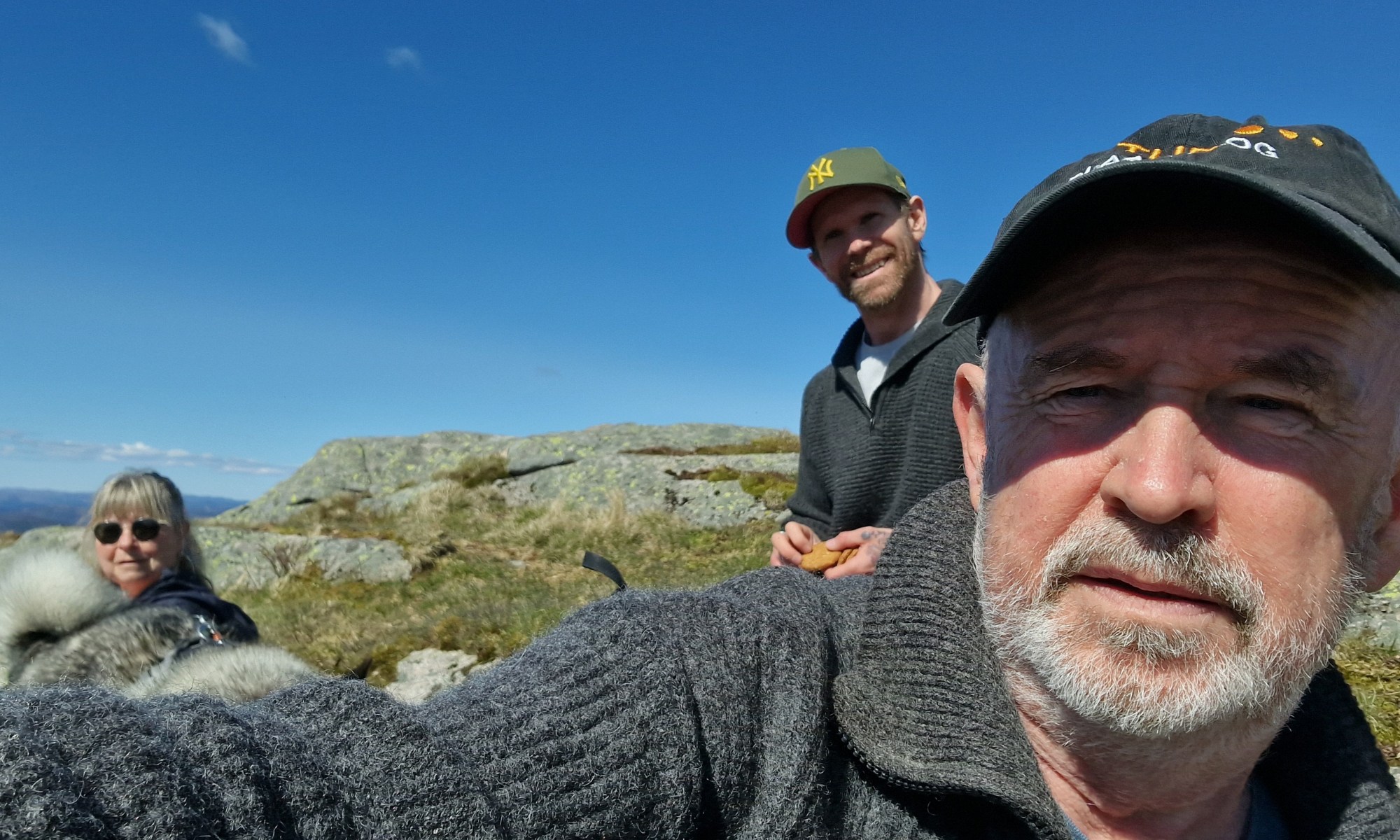 I strålende vårvær dro Tone, Fredrik, Sid, Gry og jeg på tur i dag. I går var vi ute ved sjøen, så i dag ville vi opp i «høyden». Fra veien mellom Åpta og Lyngdal startet vi turen oppover mot Homsknipa.
